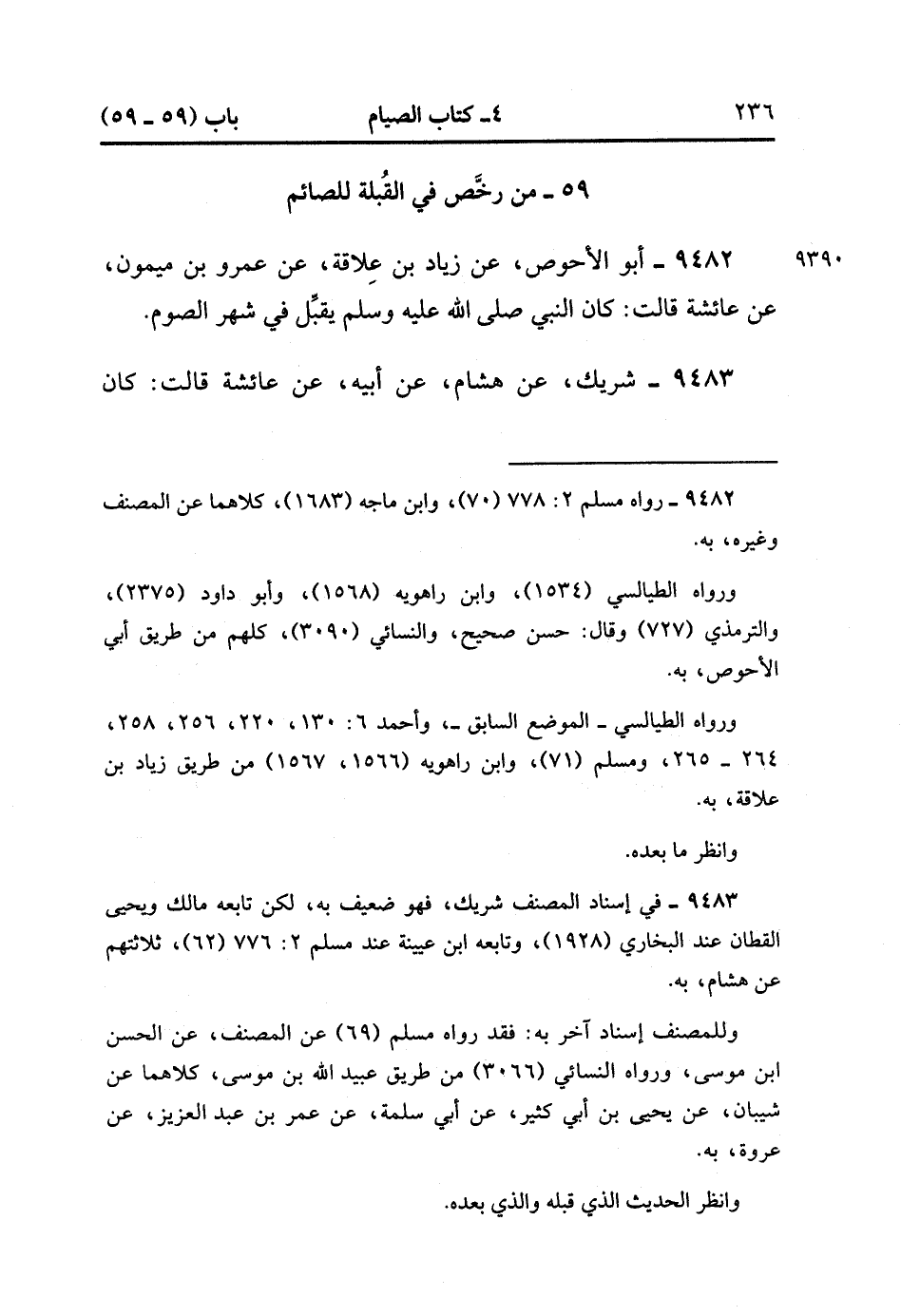 9483- حَدَّثَنَا شَرِيكٌ ، عَنْ هِشَامٍ ، عَنْ أَبِيهِ ، عَنْ عَائِشَةَ قَالَتْ : كَانَ النَّبِيُّ صَلَّى الله عَلَيْهِ وَسَلَّمَ يُقَبِّلُ بَعْضَ نِسَائِهِ وَهُوَ صَائِمٌ ، فَضَحِكَتْ ، فَظَنَنَّا أَنَّهَا هِيَ. (3/59).