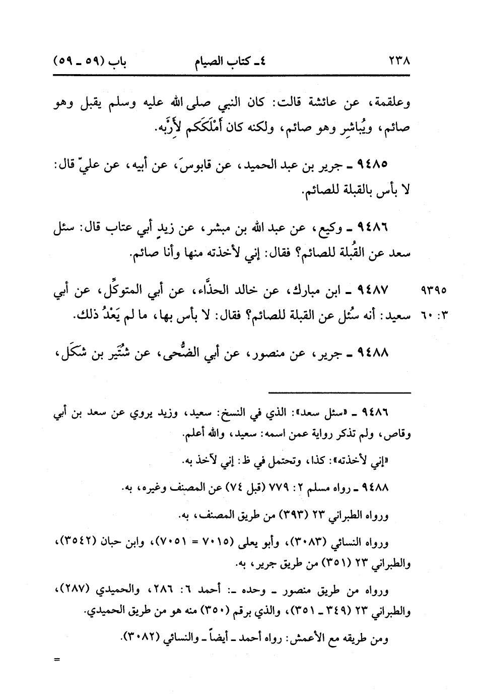 9488- حَدَّثَنَا جَرِيرٌ ، عَنْ مَنْصُورٍ ، عَنْ أَبِي الضُّحَى ، عَنْ شُتَيْرِ بْنِ شَكَلٍ ، عَنْ حَفْصَةَ بِنْتِ عُمَرَ قَالَتْ : كَانَ النَّبِيُّ صَلَّى الله عَلَيْهِ وَسَلَّمَ يُقَبِّلُ وَهُوَ صَائِمٌ. (3/60).
