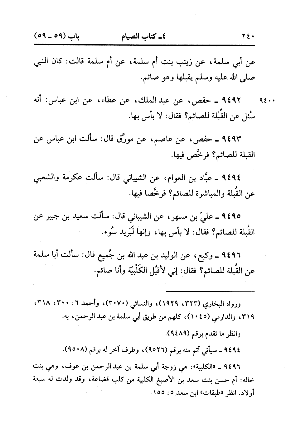 9496- حَدَّثَنَا وَكِيعٌ ، عَنِ الْوَلِيدِ بْنِ عَبْدِ اللهِ بْنِ جُمَيْعٍ ، قَالَ : سَأَلْتُ أبا سَلَمَةَ عَنِ الْقُبْلَةِ لِلصَّائِمِ ؟ فَقَالَ : إنِّي لأُقَبِّلُ الْكَلْبِيَّةَ وَأَنَا صَائِمٌ. (3/60).