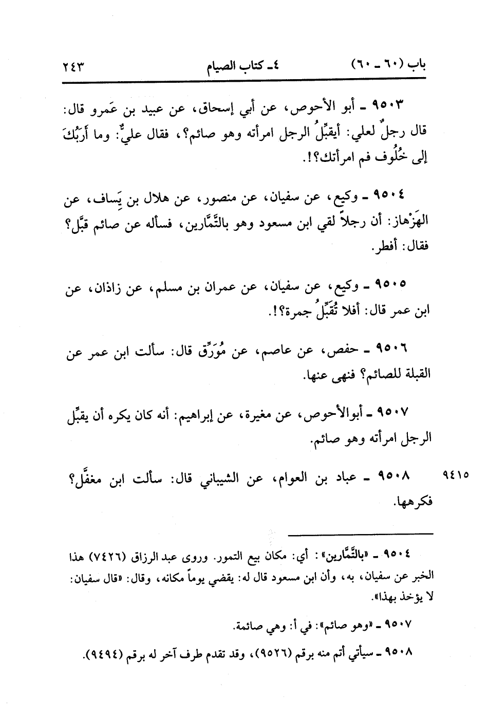 9507- حَدَّثَنَا أَبُو الأَحْوَصِِ ، عَنْ مُغِيرَةَ ، عَنْ إبْرَاهِيمَ ؛ أَنَّهُ كَانَ يَكْرَهُ أَنْ يُقَبِّلَ الرَّجُلُ امْرَأَتَهُ وَهُوَ صَائِمٌ.