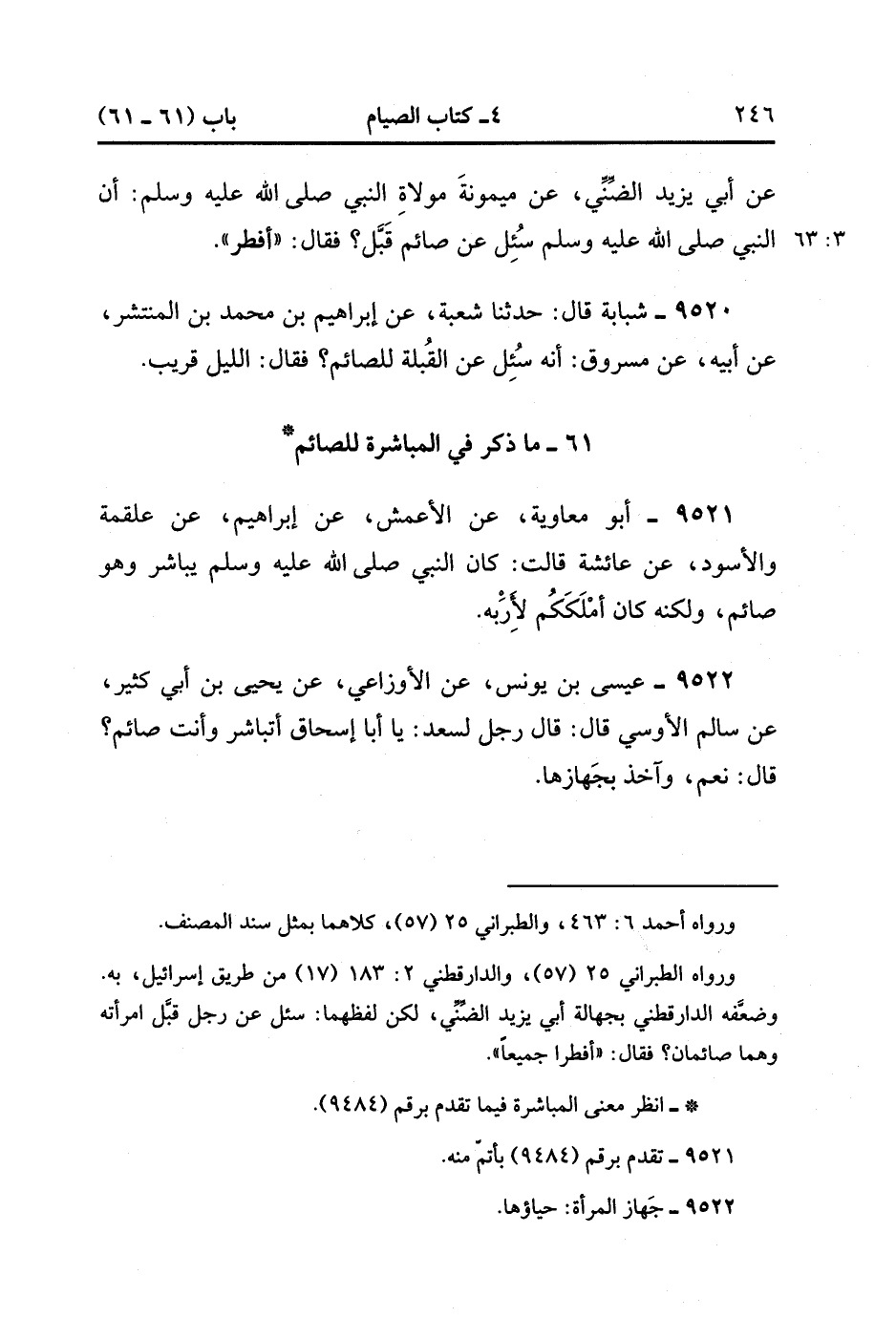 9522- حَدَّثَنَا عِيسَى بْنُ يُونُسَ ، عَنِ الأَوْزَاعِيِّ ، عَنْ يَحْيَى بْنِ أَبِي كَثِيرٍ ، عَنْ سَالِمٍ الأَوْسِيِّ ، قَالَ : قَالَ رَجُلٌ لِسَعْدٍ : يَا أَبَا إِسْحَاقَ ، أَتُبَاشِرُ وَأَنْتَ صَائِمٌ ؟ قَالَ : نَعَمْ ، وَآخُذُ بِجَهَازِهَا. (3/63).