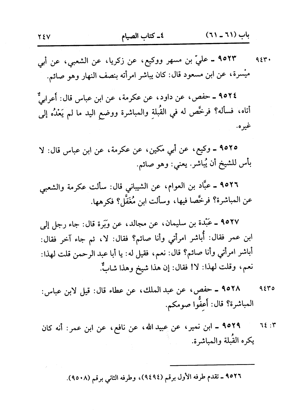9529- حَدَّثَنَا ابْنُ نُمَيْرٍ ، عَنْ عُبَيْدِ اللهِ ، عَنْ نَافِعٍ ، عَنِ ابْنِ عُمَرَ ؛ أَنَّهُ كَانَ يَكْرَهُ الْقُبْلَةَ وَالْمُبَاشَرَةَ. (3/64).