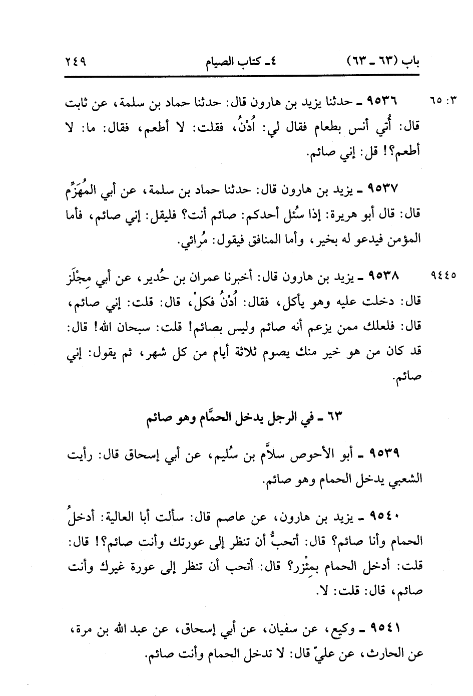 9539- حَدَّثَنَا أَبُو الأَحْوَصِِ سَلاَّمِ بْنِ سُلَيْمٍ ، عَنْ أَبِي إِسْحَاقَ ، قَالَ : رَأَيْتُ الشَّعْبِيَّ يَدْخُلُ الْحَمَّامَ وَهُوَ صَائِمٌ.