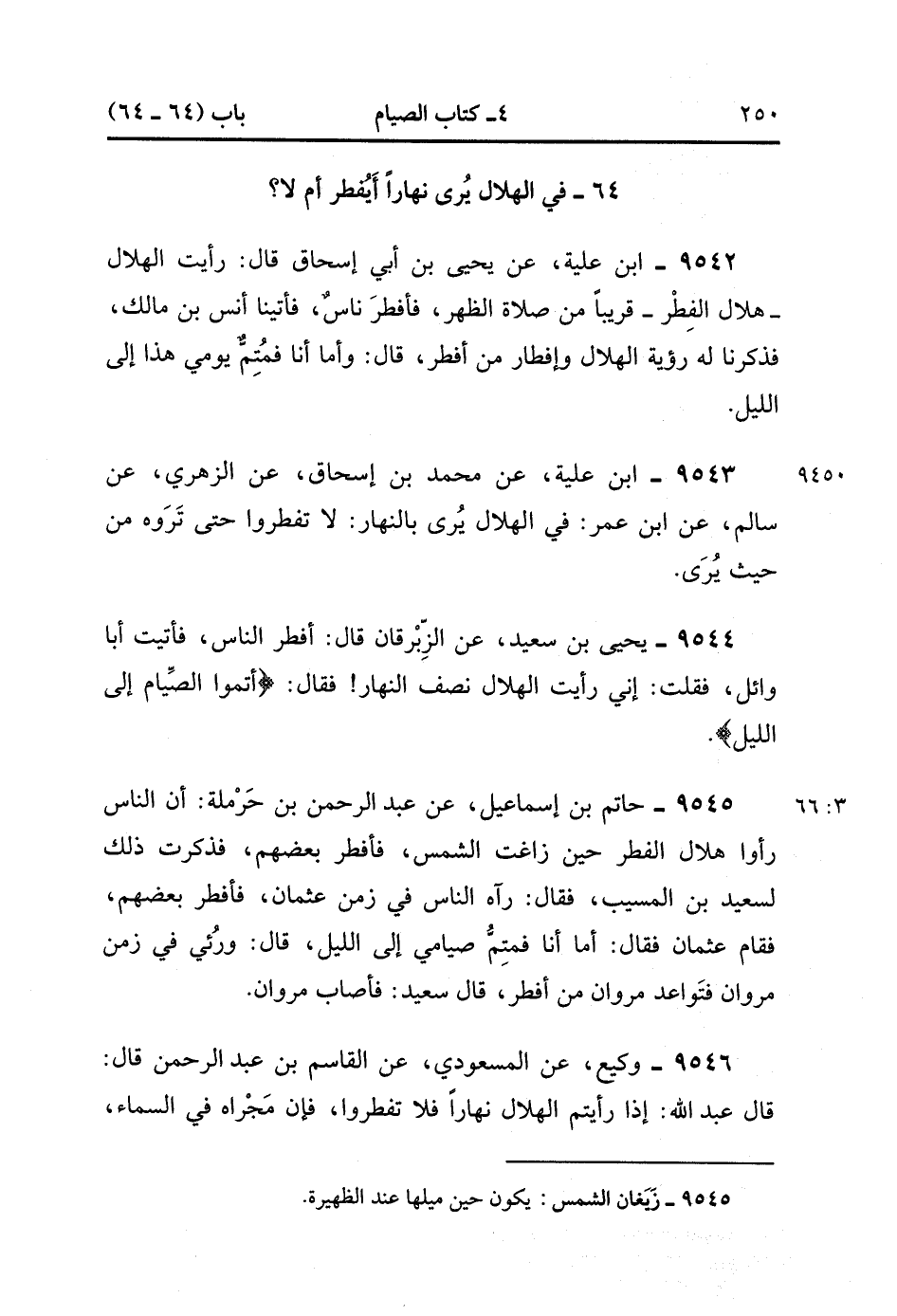 9545- حَدَّثَنَا حَاتِمُ بْنُ إسْمَاعِيلَ ، عَنْ عَبْدِ الرَّحْمَنِ بْنِ حَرْمَلَةَ ؛ أَنَّ النَّاسَ رَأَوْا هِلاَلَ الْفِطْرِ حِينَ زَاغَتِ الشَّمْسُ ، فَأَفْطَرَ بَعْضُهُمْ ، فَذَكَرْتُ ذَلِكَ لِسَعِيدِ بْنِ الْمُسَيَّبِ ، فَقَالَ : رَآهُ النَّاسُ فِي زَمَنِ عُثْمَانَ فَأَفْطَرَ بَعْضُهُمْ ، فَقَامَ عُثْمَانُ فَقَالَ : أَمَّا أَنَا فَمُتِمّ صِيَامِي إلَى اللَّيْلِ ، قَالَ : وَرُئِيَ فِي زَمَنِ مَرْوَانَ ، فَتَوَعَّدَ مَرْوَانُ مَنْ أَفْطَرَ ، قَالَ سَعِيدٌ : فَأَصَابَ مَرْوَانُ. (3/65)