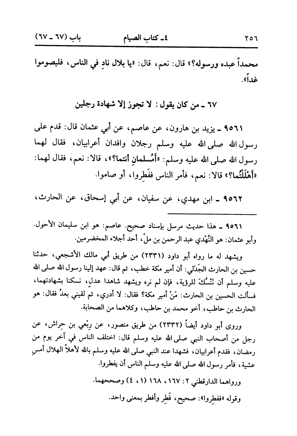 9561- حَدَّثَنَا يَزِيدُ بْنُ هَارُونَ ، عَنْ عَاصِمٍ ، عَنْ أَبِي عُثْمَانَ ، قَالَ : قَدِمَ عَلَى رَسُولِ اللهِ صَلَّى الله عَلَيْهِ وَسَلَّمَ رَجُلاَن وَافِدَان أَعْرَابِيَّان ، فَقَالَ لَهُمَا رَسُولُ اللهِ صَلَّى الله عَلَيْهِ وَسَلَّمَ : أَمُسْلِمَانِ أَنْتُمَا ؟ قَالاَ : نَعَمْ ، فَقَالَ لَهُمَا : أَهْلَلْتُمَا ؟ قَالاَ : نَعَمْ ، فَأَمَرَ النَّاسَ فَفطِرُوا ، أَوْ صَامُوا.