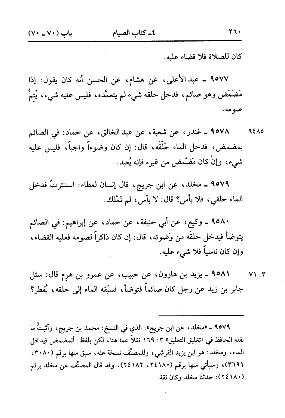 9578- حَدَّثَنَا غُنْدَرٌ ، عَنْ شُعْبَةَ ، عَنْ عَبْدِ الخَالِق ، عَنْ حَمَّادٍ ؛ فِي الصَّائِمِ يُمَضْمَضَ ، فَدَخَلَ الْمَاءُ حَلْقَهُ ، قَالَ : إِنْ كَانَ وُضُوءاً وَاجِبًا فَلَيْسَ عَلَيْهِ شَيْءٌ ، وَإِنْ كَانَ مَضْمَضَ عَنْ غَيْرِهِ فَإِنَّهُ يُعِيدُ.