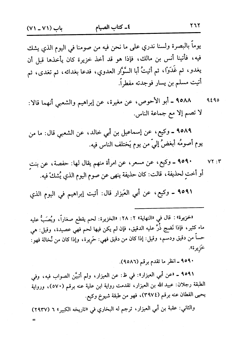 9591- حَدَّثَنَا وَكِيعٌ ، عَنِ أَبِي الْعَيْزَارِ ، قَالَ : أَتَيْتُ إبْرَاهِيمَ فِي الْيَوْمِ الَّذِي يُشَكُّ فِيهِ ، فَقَالَ : لَعَلَّك صَائِمٌ ، لاَ تَصُمْ إِلاَّ مَعَ الْجَمَاعَةِ. (3/72).