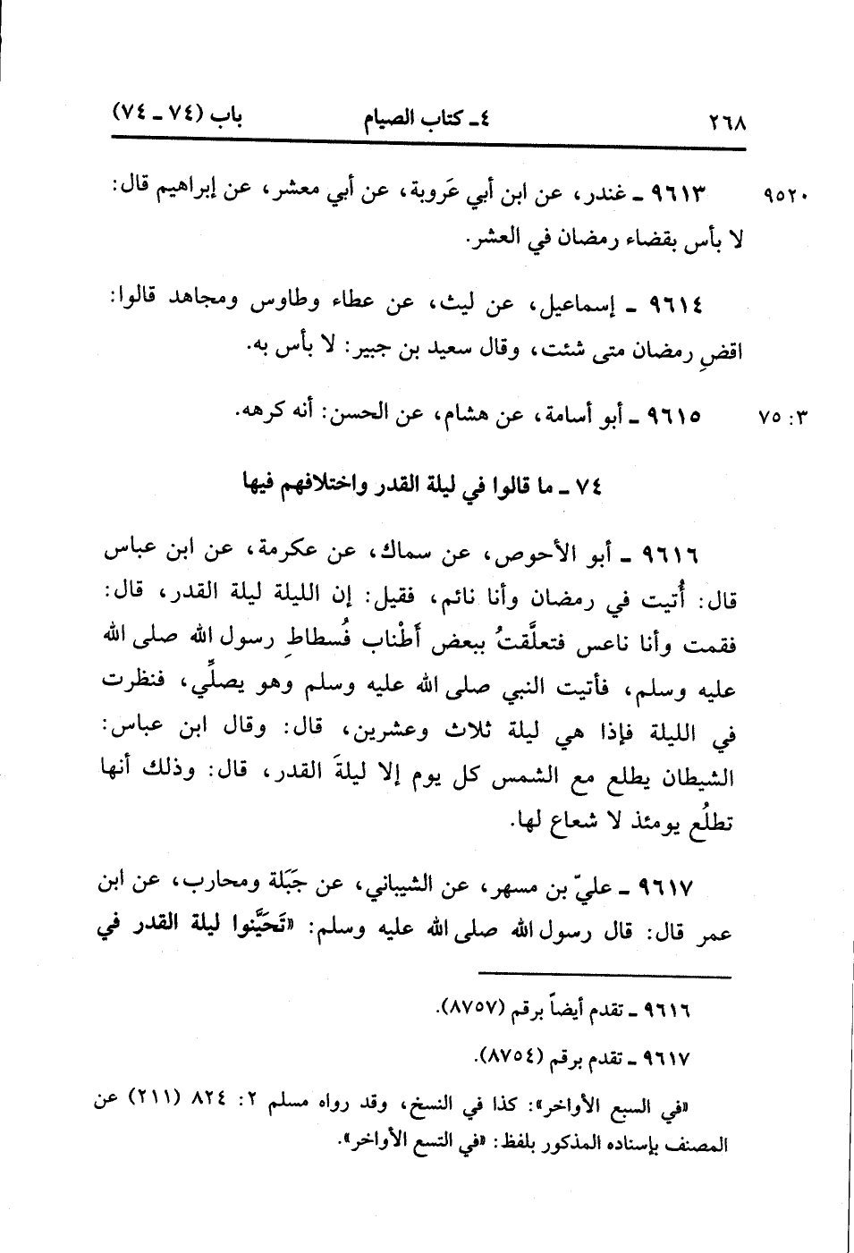 9616- حَدَّثَنَا أَبُو الأَحْوَصِِ ، عَنْ سِمَاكٍ ، عَنْ عِكْرِمَةَ ، عَنِ ابْنِ عَبَّاسٍ ، قَالَ : أُتيتُ فِي رَمَضَانَ وَأَنَا نَائِمٌ فَقِيلَ : إنَّ اللَّيْلَةَ لَيْلَةُ الْقَدْرِ ، قَالَ : فَقُمْتُ وَأَنَا نَاعِسٌ فَتَعَلَّقْت بِبَعْضِ أَطْنَابِ فُسْطَاطِ رَسُولِ اللهِ صَلَّى الله عَلَيْهِ وَسَلَّمَ ، فَأَتَيْتُ النَّبِيَّ صَلَّى الله عَلَيْهِ وَسَلَّمَ وَهُوَ يُصَلِّي ، فَنَظَرْت فِي اللَّيْلَةِ فَإِذَا هِيَ لَيْلَةُ ثَلاَثٍ وَعِشْرِينَ ، قَالَ : وَقَالَ ابْنُ عَبَّاسٍ : الشَّيْطَانُ يَطْلُعُ مَعَ الشَّمْسِ كُلَّ يَوْمٍ إِلاَّ لَيْلَةَ الْقَدْرِ ، قَالَ : وَذَلِكَ أَنَّهَا تَطْلُعُ يَوْمَئِذٍ لاَ شُعَاعَ لَهَا.