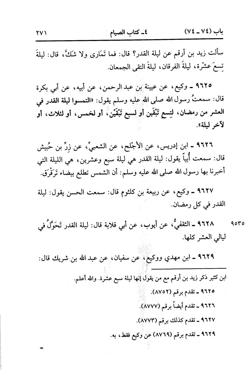 9629- حَدَّثَنَا ابْنُ مَهْدِيٍّ ، ووَكِيعٌ ، عَنْ سُفْيَانَ ، عَنْ عَبْدِ اللهِ بْنِ شَرِيكٍ ، قَالَ : سَمِعْتُ زِرًّا يَقُولُ : لَيْلَةُ الْقَدْرِ لَيْلَةُ سَبْعٍ وَعِشْرِينَ ، فَإِذَا كَانَ تِلْكَ اللَّيْلَةَ فَلْيَغْتَسِلْ أَحَدُكُمْ ، وَلْيُفْطِرْ عَلَى لَبَنٍ ، وَلْيُؤَخِّرْ فِطْرَهُ إلَى السَّحَرِ. (3/76).