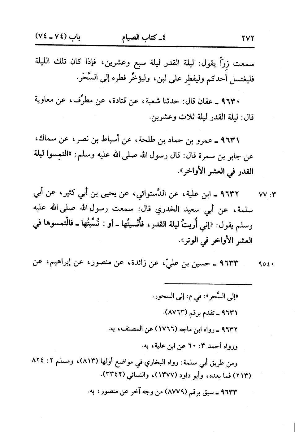 9632- حَدَّثَنَا ابْنُ عُلَيَّةَ ، عَنِ الدَّسْتُوَائِيِّ ، عَنْ يَحْيَى بْنِ أَبِي كَثِيرٍ ، عَنْ أَبِي سَلَمَةَ ، عَنْ أَبِي سَعِيدٍ الْخُدْرِيِّ ، قَالَ : سَمِعْتُ رَسُولَ اللهِ صَلَّى الله عَلَيْهِ وَسَلَّمَ يَقُولُ : إنِّي أُرِيتُ لَيْلَةَ الْقَدْرِ فَأُنْسِيتهَا ، أَوْ نُسِّيتُهَا ، فَالْتَمِسُوهَا فِي الْعَشْرِ الأَوَاخِرِ ، فِي الْوِتْرِ. (3/76)