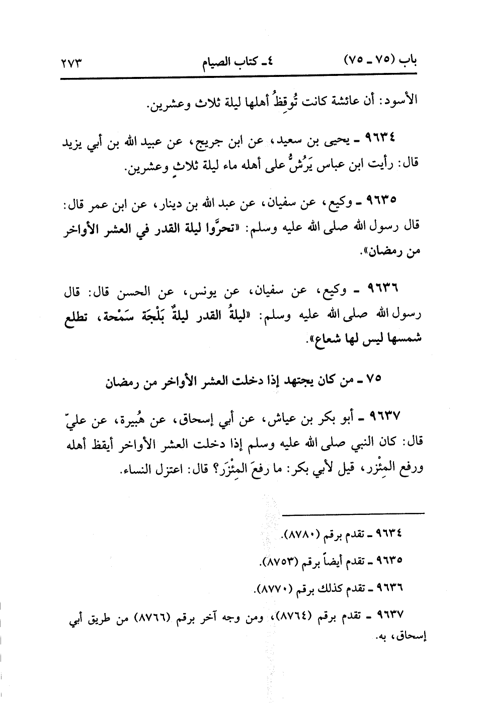 9634- حَدَّثَنَا يَحْيَى بْنُ سَعِيدٍ ، عَنِ ابْنِ جُرَيْجٍ ، عَنْ عُبَيْدِ اللهِ بْنِ أَبِي يَزِيدَ ، قَالَ : رَأَيْتُ ابْنَ عَبَّاسٍ يَرُشُّ عَلَى أَهْلِهِ مَاءً لَيْلَةَ ثَلاَثٍ وَعِشْرِينَ.