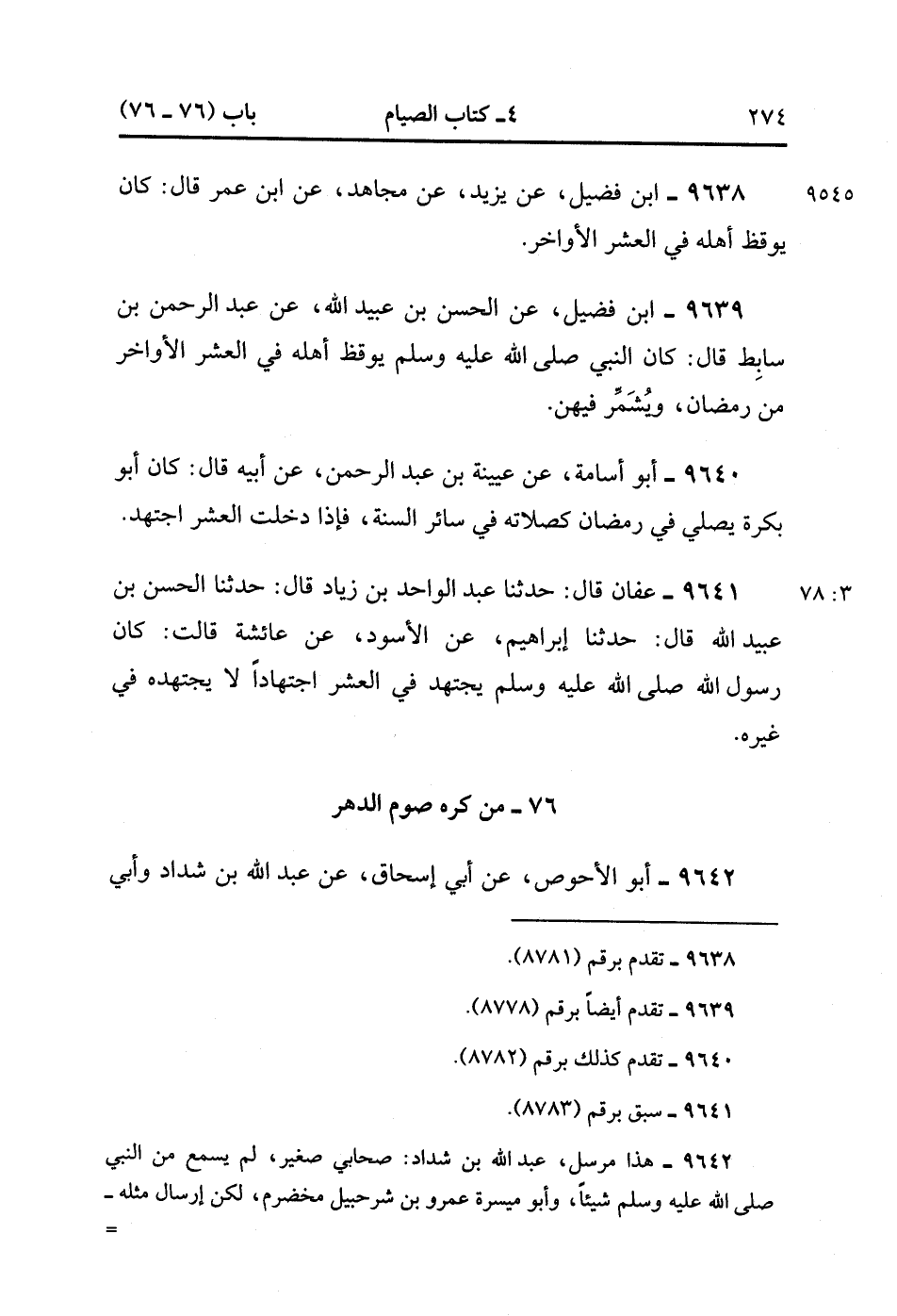 9641- حَدَّثَنَا عَفَّانُ , قَالَ : حدَّثَنَا عَبْدُ الْوَاحِدِ بْنُ زِيَادٍ ، قَالَ : حَدَّثَنَا الْحَسَنُ بْنُ عُبَيْدِ اللهِ , قَالَ : حدَّثَنَا إبْرَاهِيمُ ، عَنِ الأَسْوَد ، عَنْ عَائِشَةَ قَالَتْ : كَانَ رَسُولُ اللهِ صَلَّى الله عَلَيْهِ وَسَلَّمَ يَجْتَهِدُ فِي الْعَشْرِ اجْتِهَادًا ، لاَ يَجْتَهِدُه فِي غَيْرِهِ. (3/78).