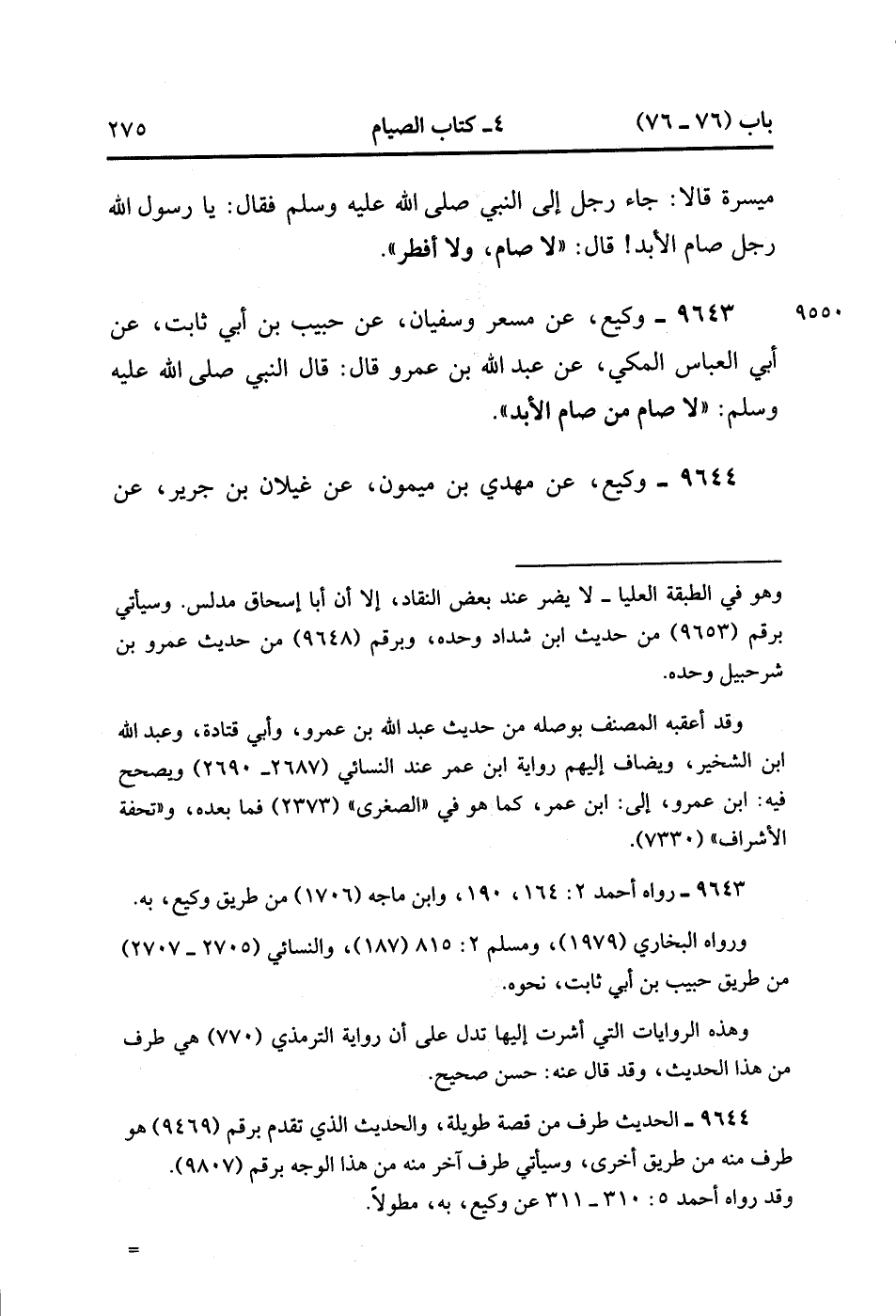 9643- حَدَّثَنَا وَكِيعٌ ، عَنْ مِسْعَرٍ ، وَسُفْيَانَ ، عَنْ حَبِيبِ بْنِ أَبِي ثَابِتٍ ، عَنْ أَبِي الْعَبَّاسِ الْمَكِّيِّ ، عَنْ عَبْدِ اللهِ بْنِ عَمْرٍو قَالَ : قَالَ النَّبِيُّ صَلَّى الله عَلَيْهِ وَسَلَّمَ : لاَ صَامَ مَنْ صَامَ الأَبَدَ. (3/78).