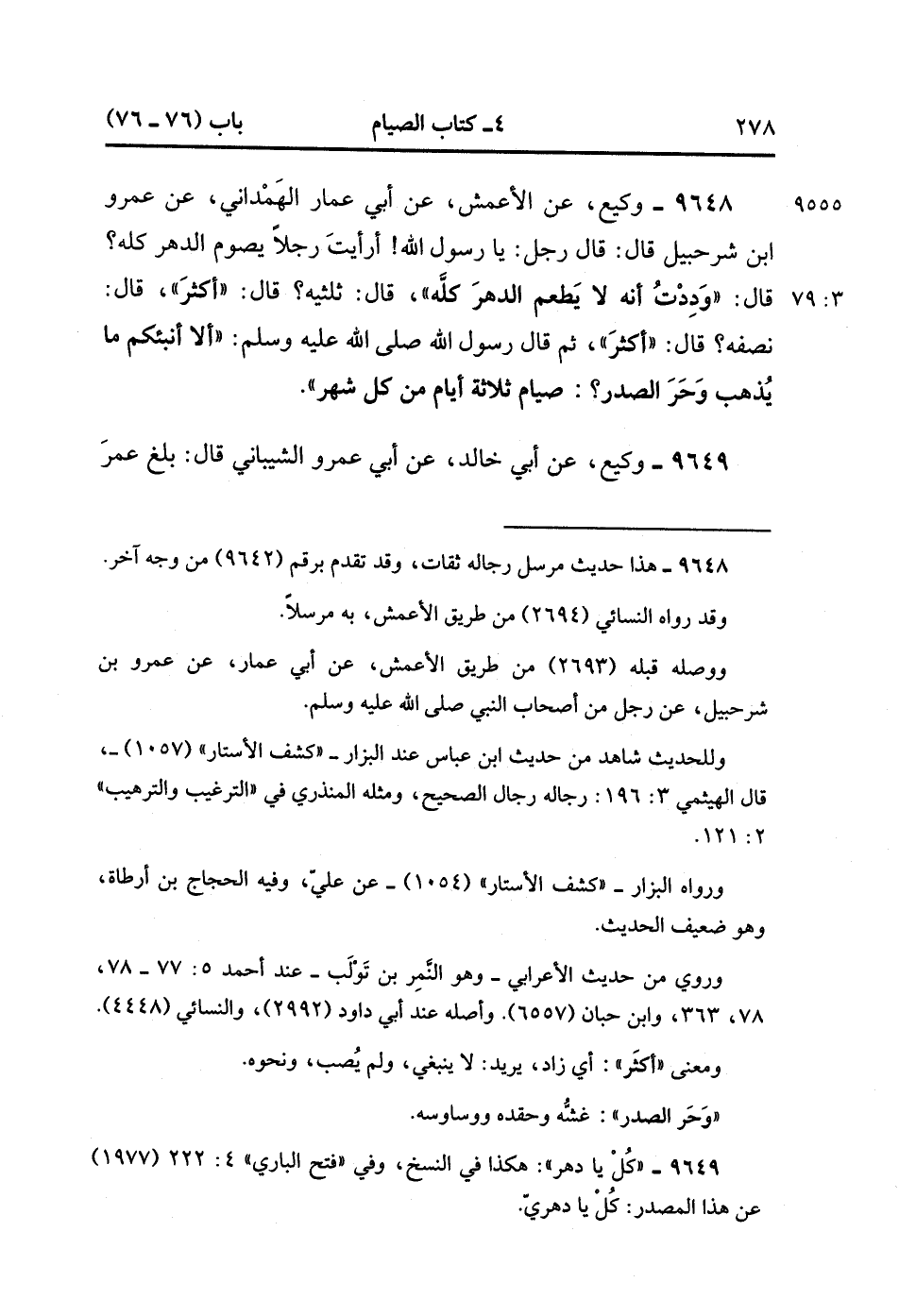 9648- حَدَّثَنَا وَكِيعٌ ، عَنِ الأَعْمَشِ ، عَنْ أَبِي عَمَّارٍ الْهَمْدَانِيِّ ، عَنْ عَمْرِو بْنِ شُرَحْبِيلَ ، قَالَ : قَالَ رَجُلٌ : يَا رَسُولَ اللهِ ، أَرَأَيْتَ رَجُلاً يَصُومُ الدَّهْرَ كُلَّهُ ؟ قَالَ : وَدِدْتُ أَنَّهُ لاَ يَطْعَمُ الدَّهْرَ كُلَّهُ ، قَالَ : ثُلُثَيْهِ ؟ قَالَ : أَكْثَرُ ، قَالَ : نِصْفَهُ ؟ قَالَ : أَكْثَرُ ، ثُمَّ قَالَ رَسُولُ اللهِ صَلَّى الله عَلَيْهِ وَسَلَّمَ : أَلاَ أُنَبِّئُكُمْ مَا يُذْهِبُ وَحْر الصَّدْرِ : صِيَامُ ثَلاَثَةِ أَيَّامٍ مِنْ كُلِّ شَهْرٍ. (3/78)