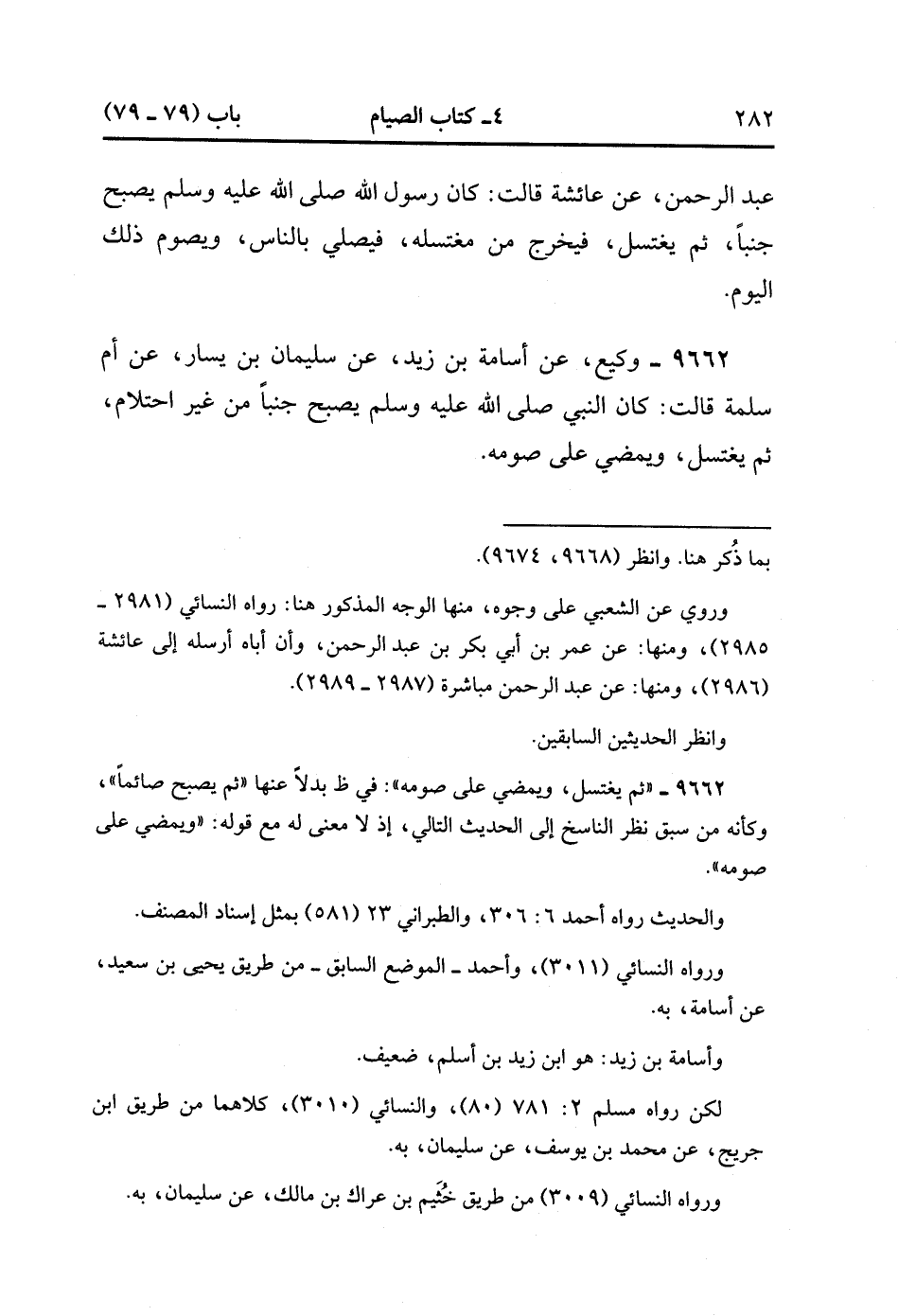 9662- حَدَّثَنَا وَكِيعٌ ، عَنْ أُسَامَةَ بْنِ زَيْدٍ ، عَنْ سُلَيْمَانَ بْنِ يَسَارٍ ، عَنْ أُمِّ سَلَمَةَ قَالَتْ : كَانَ النَّبِيُّ صَلَّى الله عَلَيْهِ وَسَلَّمَ يُصْبِحُ جُنُبًا مِنْ غَيْرِ احْتِلاَمٍ ، ثُمَّ يَغْتَسِلُ وَيَمْضِي عَلَى صَوْمِهُ. (3/80).