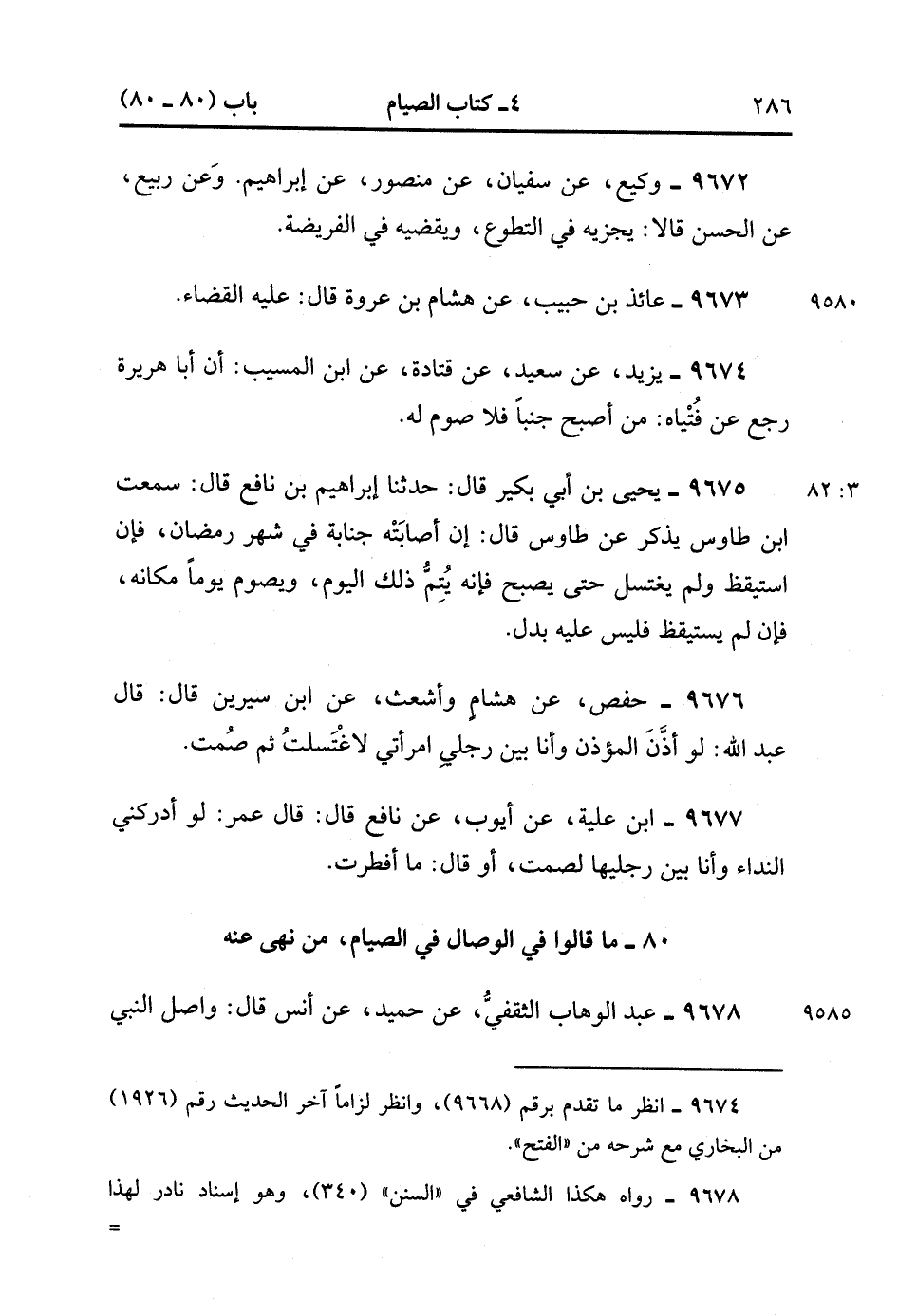 9677- حَدَّثَنَا ابْنُ عُلَيَّةَ ، عَنْ أَيُّوبَ ، عَنْ نَافِعٍ ، قَالَ : قَالَ عُمَرُ : لَوْ أَدْرَكَنِي النِّدَاءُ وَأَنَا بَيْنَ رِجْلَيْهَا لَصُمْتُ ، أَوَ قَالَ : مَا أَفْطَرْت. (3/82).