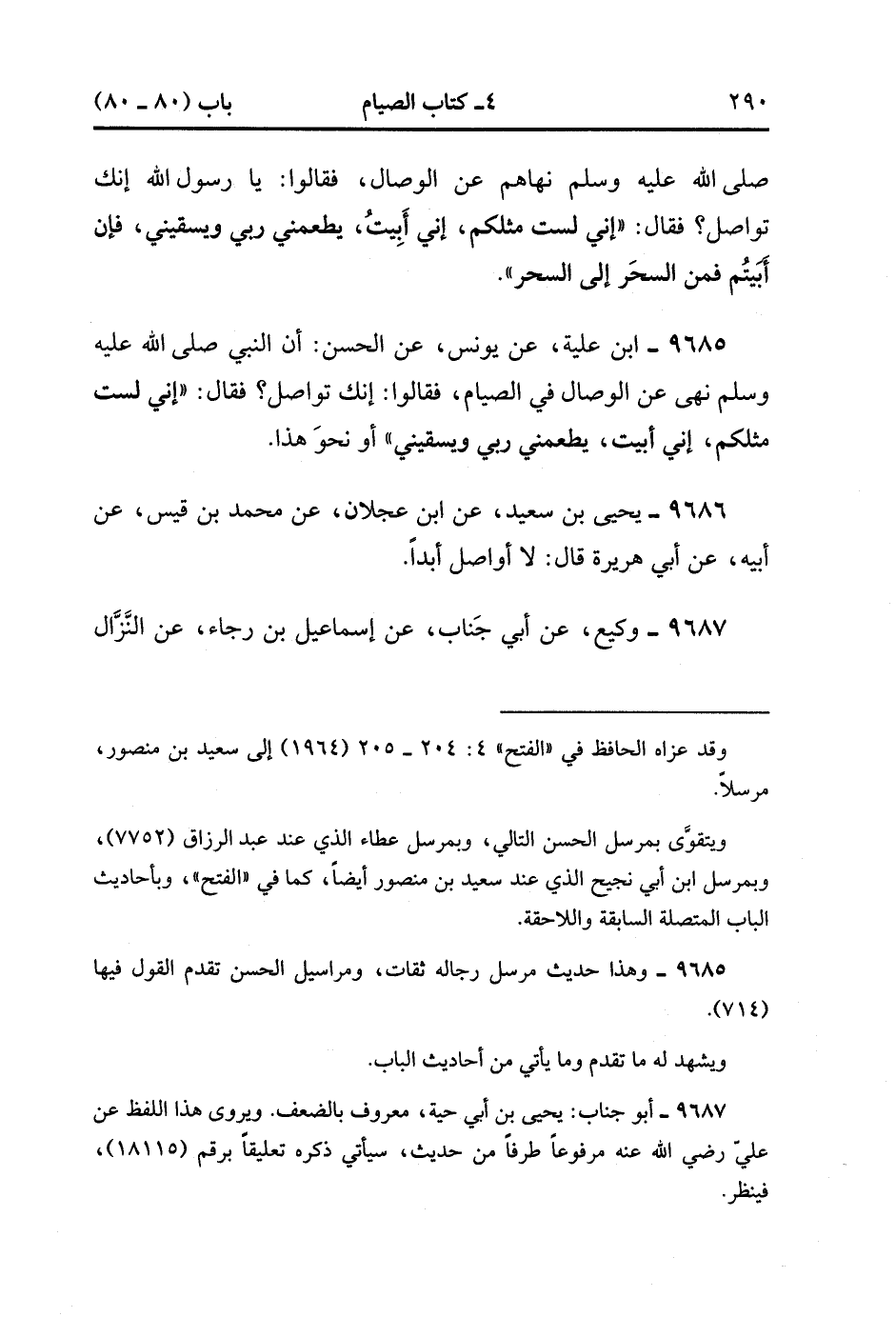 9687- حَدَّثَنَا وَكِيعٌ ، عَنْ أَبِي جَنَابٍ ، عَنْ إسْمَاعِيلَ بْنِ رَجَاءٍ ، عَنِ النَّزَّالِ بْنِ سَبْرَةَ ، عَنْ عَلِيٍّ ، قَالَ : لاَ وِصَالَ فِي صِِيَامٍ. (3/83).