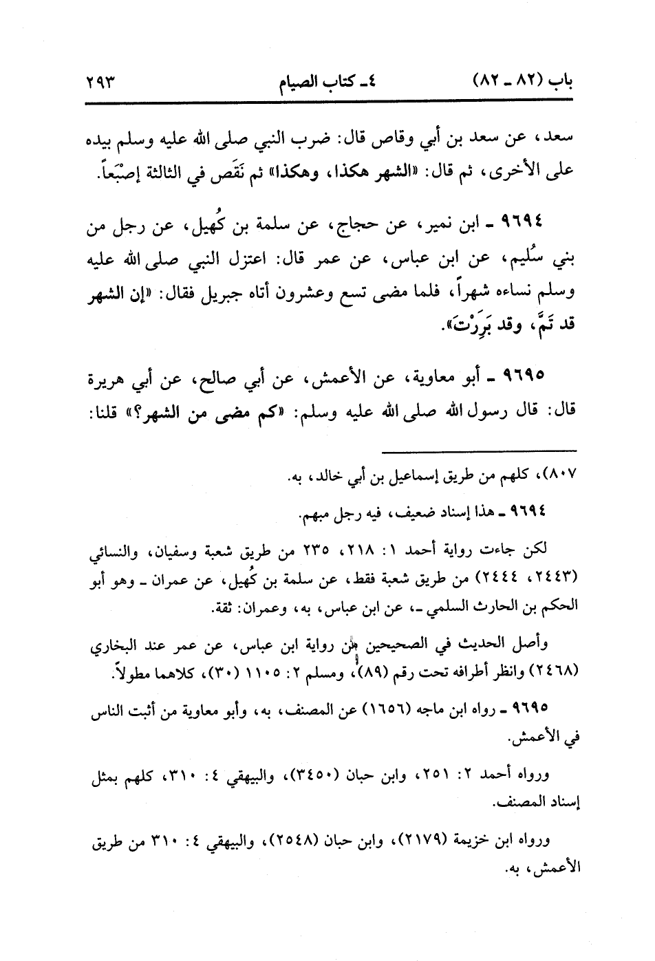 9695- حَدَّثَنَا أَبُو مُعَاوِيَةَ ، عَنِ الأَعْمَشِ ، عَنْ أَبِي صَالِحٍ ، عَنْ أَبِي هُرَيْرَةَ ، قَالَ : قَالَ رَسُولُ اللهِ صَلَّى الله عَلَيْهِ وَسَلَّمَ : كَمْ مَضَى مِنَ الشَّهْرِ ؟ قُلْنَا : مَضَى اثْنَانِ وَعِشْرُونَ يَوْمًا ، وَبَقِيَتْ ثَمَان ، فَقَالَ النَّبِيُّ صَلَّى الله عَلَيْهِ وَسَلَّمَ : بَلْ مَضَتَ ثنَتَانِ وَعِشْرُونَ ، وَبَقِيَتْ سَبْعٌ ، الْتَمِسُوهَا اللَّيْلَةَ ، ثُمَّ قَالَ : قَالَ النَّبِيُّ صَلَّى الله عَلَيْهِ وَسَلَّمَ : الشَّهْرُ هَكَذَا ، وَالشَّهْرُ هَكَذَا ، ثَلاَثَ مَرَّاتٍ ، وَأَمْسَكَ وَاحِدَةً. (3/84).