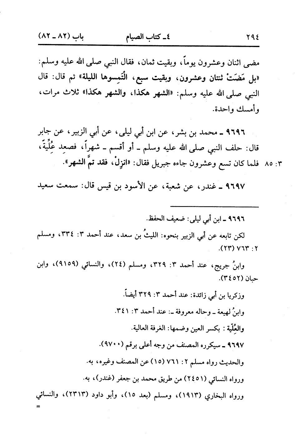 9696- حَدَّثَنَا مُحَمَّدُ بْنُ بِشْرٍ ، عَنِ ابْنِ أَبِي لَيْلَى ، عَنْ أَبِي الزُّبَيْرِ ، عَنْ جَابِرٍ ، قَالَ : حَلَفَ النَّبِيُّ صَلَّى الله عَلَيْهِ وَسَلَّمَ ، أَوْ أَقْسَمَ شَهْرًا ، فَصَعِدَ عُلية ، فَلَمَّا كَانَ تِسْعٌ وَعِشْرُونَ جَاءَهُ جِبْرِيلُ ، فَقَالَ : انْزِلْ ، فَقَدْ تَمَّ الشَّهْرُ. (3/84)