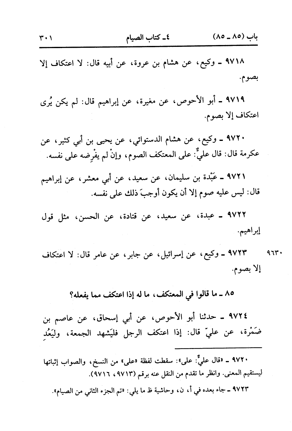 9719- حَدَّثَنَا أَبُو الأَحْوَصِِ ، عَنْ مُغِيرَةَ ، عَنْ إبْرَاهِيمَ ، قَالَ : لَمْ يَكُنْ يُرَى اعْتِكَافٌ إِلاَّ بِصَوْمٍ.