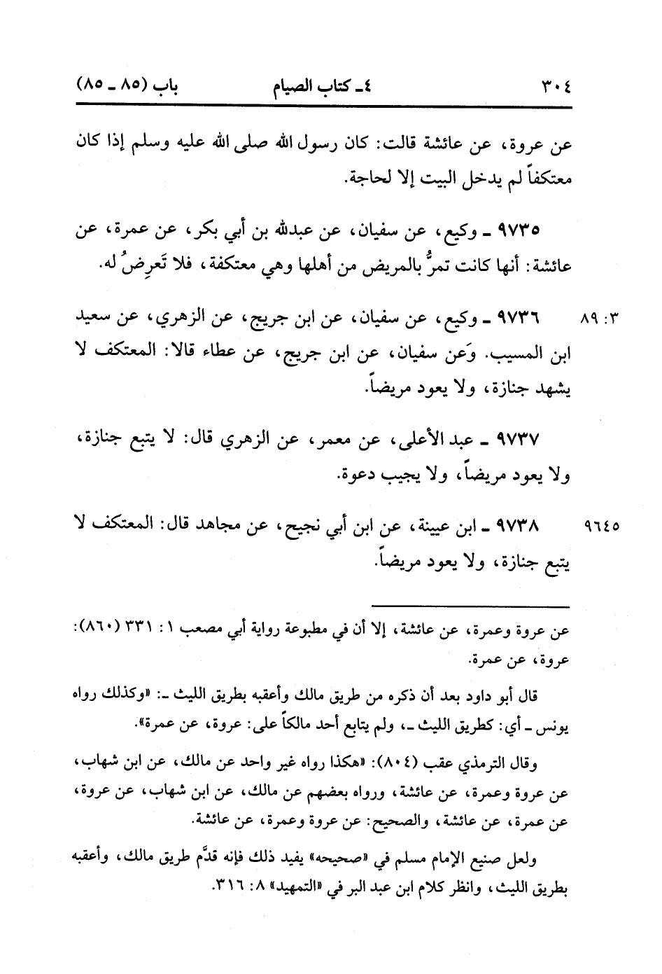 9735- حَدَّثَنَا وَكِيعٌ ، عَنْ سُفْيَانَ ، عَنْ عَبْدِ اللهِ بْنِ أَبِي بَكْرٍ ، عَنْ عَمْرَةَ ، عَنْ عَائِشَةَ ؛ أَنَّهَا كَانَتْ تَمُرُّ بِالْمَرِيضِ مِنْ أَهْلِهَا وَهِيَ مُعْتَكِفَةٌ ، فَلاَ تَعْرِضُ لَهُ. (3/88)