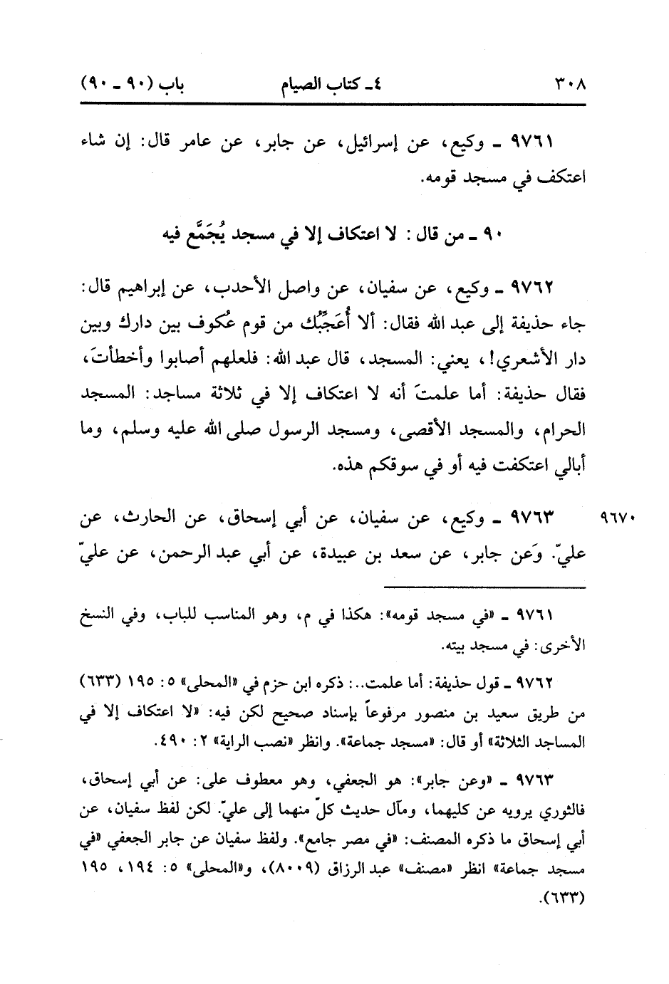 9763- حَدَّثَنَا وَكِيعٌ ، عَنْ سُفْيَانَ ، عَنْ أَبِي إِسْحَاقَ ، عَنِ الْحَارِثِ ، عَنْ عَلِيٍّ (ح) وَعَنْ جَابِرٍ ، عَنْ سَعْدِ بْنِ عُبَيْدَةَ ، عَنْ أَبِي عَبْدِ الرَّحْمَنِ ، عَنْ عَلِيٍّ ، قَالَ : لاَ اعْتِكَافَ إِلاَّ فِي مِصْرٍ جَامِعٍ. (3/91).