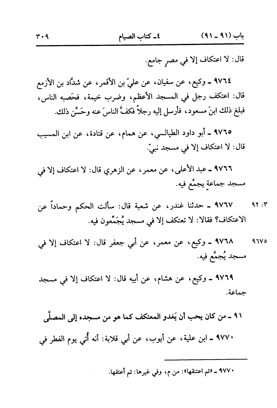 9767- حَدَّثَنَا غُنْدَرٌ ، عَنْ شُعْبَةَ ، قَالَ : سَأَلْتُ الْحَكَمَ ، وَحَمَّادًا عَنِ الاِعْتِكَافِ ؟ فَقَالاَ : لاَ تَعْتَكِف إِلاَّ فِي مَسْجِدٍ يُجَمِّعُونَ فِيهِ.