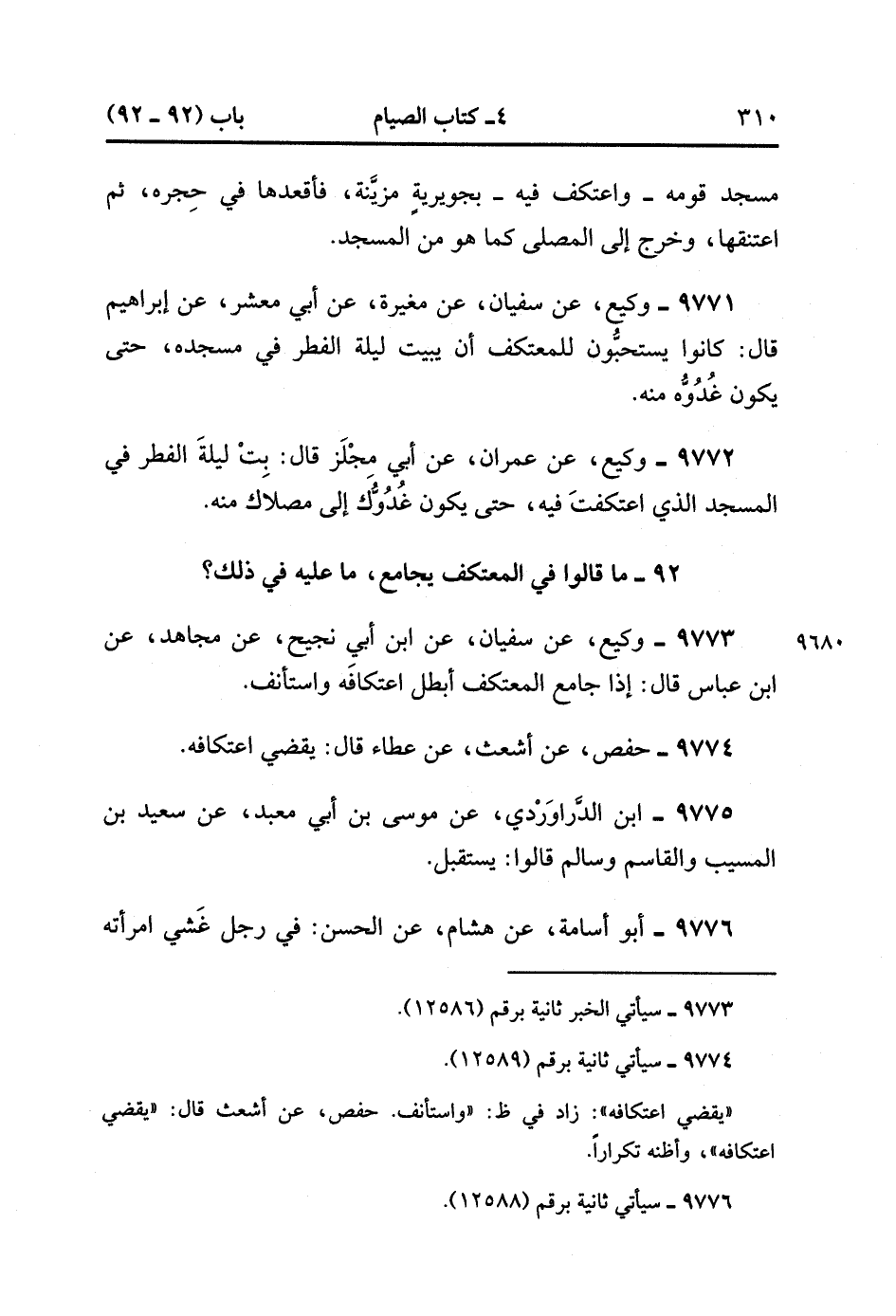 9771- حَدَّثَنَا وَكِيعٌ ، عَنْ سُفْيَانَ ، عَنْ مُغِيرَةَ ، عَنْ أَبِي مَعْشَرٍ ، عَنْ إبْرَاهِيمَ ، قَالَ : كَانُوا يَسْتَحِبُّونَ لِلْمُعْتَكِفِ أَنْ يَبِيتَ لَيْلَةَ الْفِطْرِ فِي مَسْجِدِهِ ، حَتَّى يَكُونَ غُدُوُّهُ مِنْهُ.