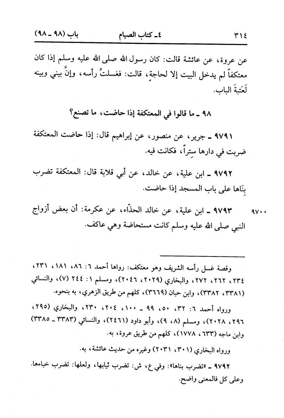 9793- حَدَّثَنَا ابْنُ عُلَيَّةَ ، عَنْ خَالِدٍ الْحَذَّاءِ ، عَنْ عِكْرِمَةَ ؛ أَنَّ بَعْضَ أَزْوَاجِ النَّبِيِّ صَلَّى الله عَلَيْهِ وَسَلَّمَ كَانَتْ مُسْتَحَاضَةً وَهِيَ عَاكِفٌ. (3/94).