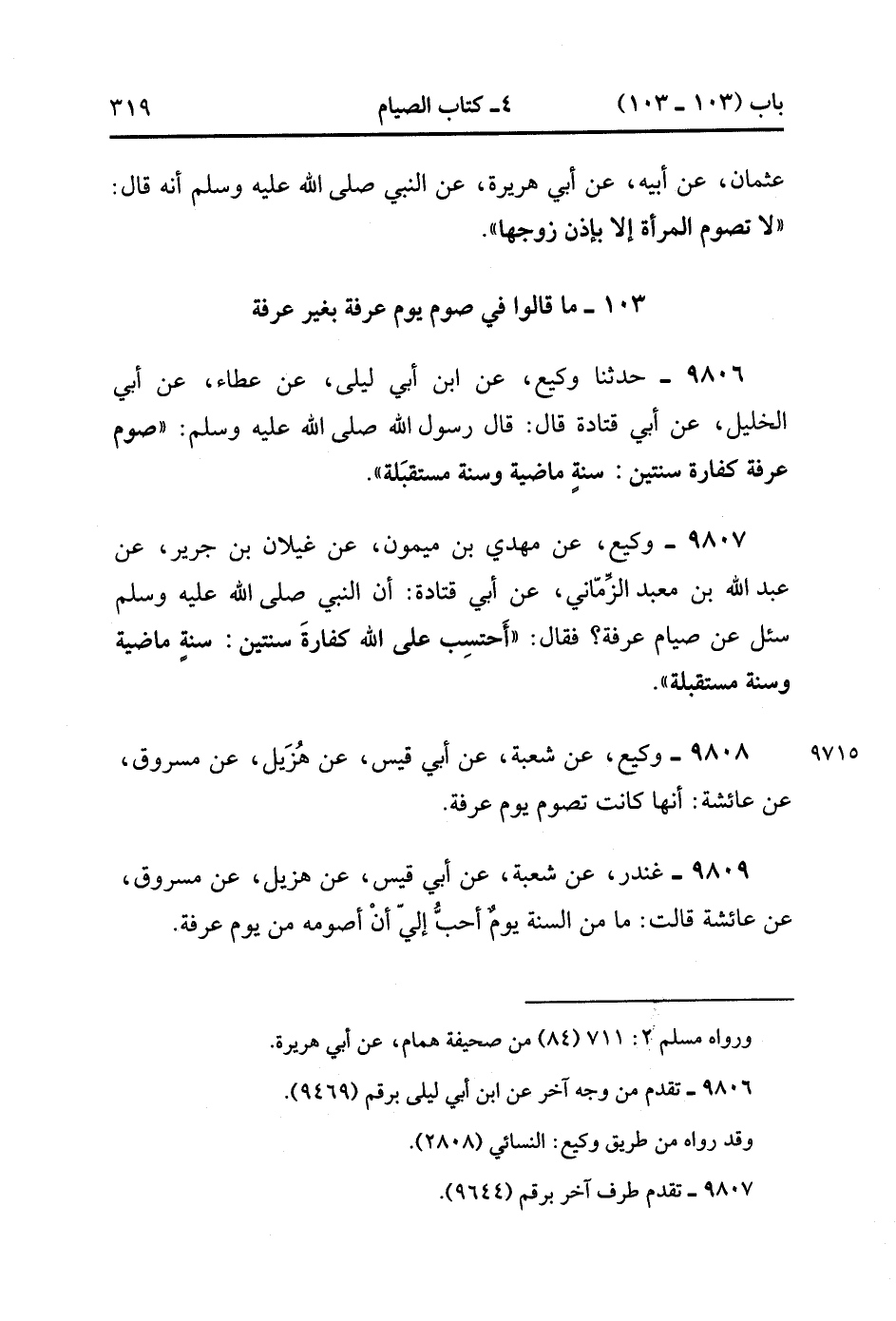 9806- حَدَّثَنَا وَكِيعٌ ، عَنِ ابْنِ أَبِي لَيْلَى ، عَنْ عَطَاءٍ ، عَنْ أَبِي الْخَلِيلِ ، عَنْ أَبِي قَتَادَةَ ، قَالَ : قَالَ رَسُولُ اللهِ صَلَّى الله عَلَيْهِ وَسَلَّمَ : صَوْمُ عَرَفَةَ كَفَّارَةُ سَنَتَيْنِ : سَنَةٍ مَاضِيَةٍ ، وَسَنَةٍ مُسْتَقْبَلَةٍ.