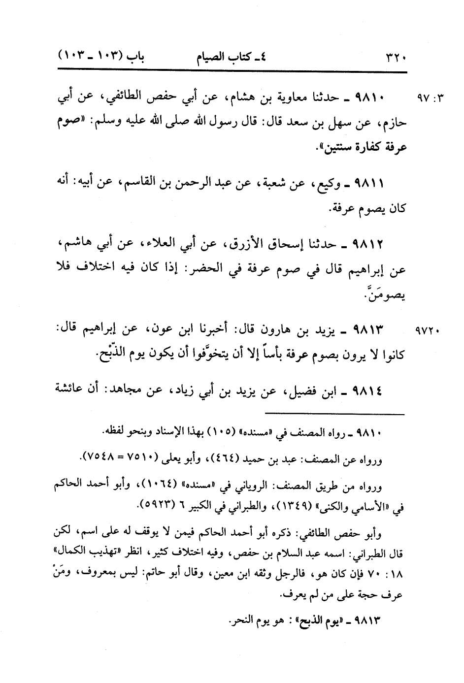 9810- حَدَّثَنَا مُعَاوِيَةُ بْنُ هِشَامٍ ، عَنْ أَبِي حَفْصٍ الطَّائِفِيِّ ، عَنْ أَبِي حَازِمٍ ، عَنْ سَهْلِ بْنِ سَعْدٍ ، قَالَ : قَالَ رَسُولُ اللهِ صَلَّى الله عَلَيْهِ وَسَلَّمَ : صَوْمُ عَرَفَةَ كَفَّارَةُ سَنَتَيْنِ.