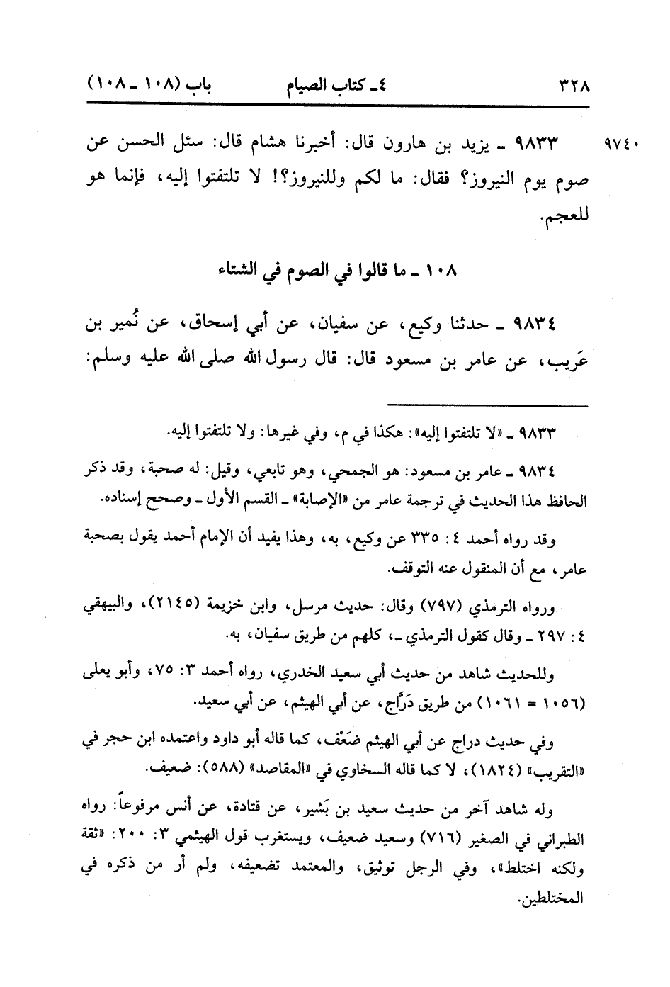 9834- حَدَّثَنَا وَكِيعٌ ، عَنْ سُفْيَانَ ، عَنْ أَبِي إِسْحَاقَ ، عَنْ نُمَيْرِ بن عَرِيبٍ ، عَنْ عَامِرِ بْنِ مَسْعُود ، قَالَ : قَالَ رَسُولُ اللهِ صَلَّى الله عَلَيْهِ وَسَلَّمَ : الصَّوْمُ فِي الشِّتَاءِ الْغَنِيمَةُ الْبَارِدَةُ. (3/100).