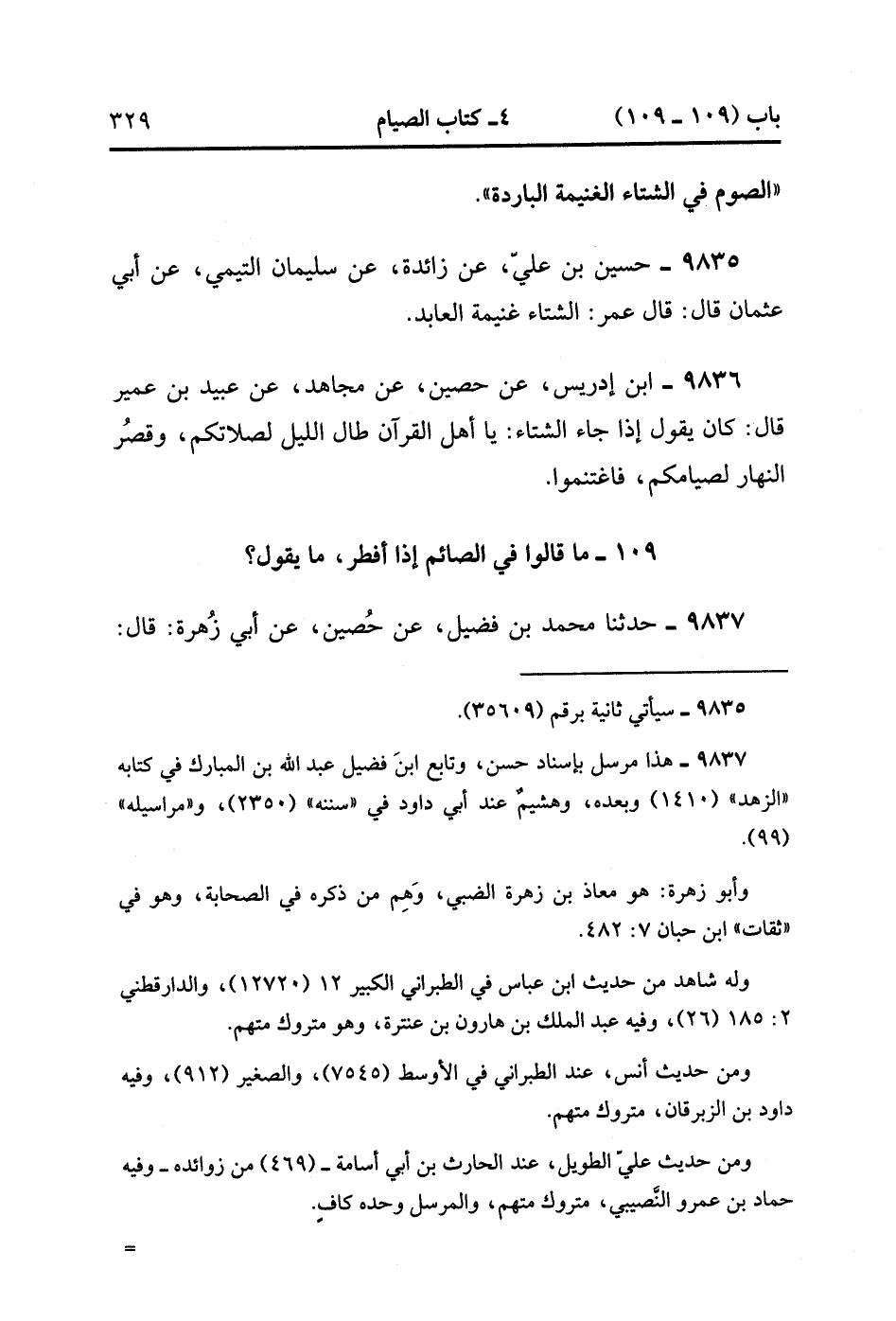 9835- حَدَّثَنَا حُسَيْنُ بْنُ عَلِيٍّ ، عَنْ زَائِدَةَ ، عَنْ سُلَيْمَانَ التَّيْمِيِّ ، عَنْ أَبِي عُثْمَانَ ، قَالَ : قَالَ عُمَرُ : الشِّتَاءُ غَنِيمَةُ العَابِدِ.