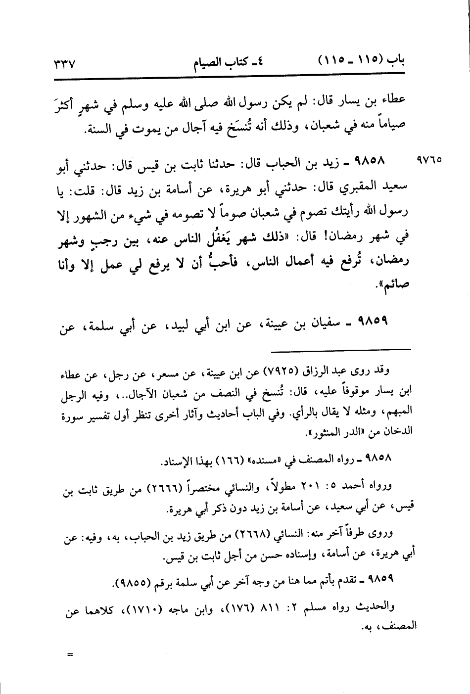 9858- حَدَّثَنَا زَيْدُ بْنُ الْحُبَابِ ، قَالَ : حَدَّثَتَا ثَابِتُ بْنُ قَيْسٍ ، قَالَ : حدَّثَنِي أَبُو سَعِيدٍ الْمَقْبُرِيُّ ، قَالَ : حَدَّثَنِي أَبُو هُرَيْرَةَ ، عَنْ أُسَامَةَ بْنِ زَيْدٍ ، قَالَ : قُلْتُ : يَا رَسُولَ اللهِ ، رَأَيْتُك تَصُومُ فِي شَعْبَانَ صَوْمًا لاَ تَصُومُه فِي شَيْءٍ مِنَ الشُّهُورِ ، إِلاَّ فِي شَهْرِ رَمَضَانَ ؟ قَالَ : ذَلِكَ شَهْرٌ يَغْفُلُ النَّاسُ عَنْهُ ، بَيْنَ رَجَبٍ وَشَهْرِ رَمَضَانَ ، تُرْفَعُ فِيهِ أَعْمَالُ النَّاسِ ، فَأُحِبُّ أَنْ لاَ يُرْفَعَ لِي عَمَلٌ إِلاَّ وَأَنَا صَائِمٌ.