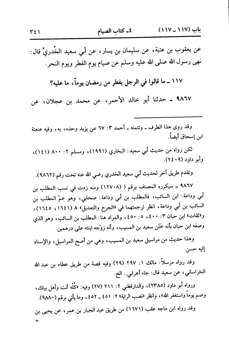 9867- حَدَّثَنَا أَبُو خَالِدٍ الأَحْمَرِِ ، عَنْ مُحَمَّدِ بْنِ عَجْلاَنَ ، عَنِ الْمُطَّلِبِ بْنِ أَبِي وَدَاعَةَ ، عَنْ سَعِيدِ بْنِ الْمُسَيَّبِ ، قَالَ : جَاءَ رَجُلٌ إلَى النَّبِيِّ صَلَّى الله عَلَيْهِ وَسَلَّمَ ، فَقَالَ : إنِّي أَفْطَرْت يَوْمًا مِنْ رَمَضَانَ ، فَقَالَ لَهُ النَّبِيُّ صَلَّى الله عَلَيْهِ وَسَلَّمَ : تَصَدَّقْ ، وَاسْتَغْفِرَ اللَّهَ ، وَصُمْ يَوْمًا مَكَانَهُ. (3/104).
