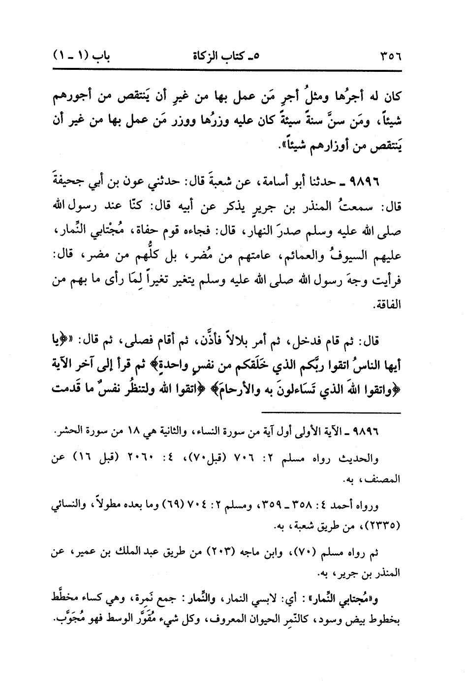 9896- حَدَّثَنَا أَبُو أُسَامَةَ ، عَنْ شُعْبَةَ ، قَالَ : حدَّثَنِي عَوْنُ بْنُ أَبِي جُحَيْفَةَ ، قَالَ : سَمِعْتُ الْمُنْذِرَ بْنَ جَرِيرٍ يَذْكُرُ ، عَنْ أَبِيهِ ، قَالَ : كُنَّا عِنْدَ رَسُولِ اللهِ صَلَّى الله عَلَيْهِ وَسَلَّمَ صَدْرَ النَّهَارِ ، قَالَ : فَجَاءَهُ قَوْمٌ حُفَاةٌ ، مُجْتَابِي النِّمَارِ ، عَلَيْهِمَ السُّيُوفُ وَالْعَمَائِمُ ، عَامَّتُهُمْ مِنْ مُضَرَ ، بَلْ كُلُّهُمْ مِنْ مُضَرَ ، قَالَ : فَرَأَيْتُ وَجْهَ رَسُولِ اللهِ صَلَّى الله عَلَيْهِ وَسَلَّمَ يَتَغَيَّرُ تَغَيُّرًا لِمَا رَأَى بِهِمْ مِنَ الْفَاقَةِ ، قَالَ : ثُمَّ قَامَ فَدَخَلَ الْمَسْجِدَ ، ثُمَّ أَمَرَ بِلاَلاً فَأَذَّنَ ، ثُمَّ أَقَامَ فَصَلَّى ، ثُمَّ قَالَ : {يَا أَيُّهَا النَّاسُ اتَّقُوا رَبَّكُمُ الَّذِي خَلَقَكُمْ مِنْ نَفْسٍ وَاحِدَةٍ} ، ثُمَّ قَرَأَ إلَى آخِرِ الآيَةِ : {وَاتَّقُوا اللَّهَ الَّذِي تَسَاءَلُونَ بِهِ وَالأَرْحَامَ} ، {اتَّقُوا اللَّهَ وَلْتَنْظُرْ نَفْسٌ مَا قَدَّمَتْ لِغَدٍ} تَصَدَّقَ امْرُؤٌ مِنْ دِينَارِهِ وَمِنْ دِرْهَمِهِ ، وَمِنْ ثَوْبِهِ وَمِنْ صَاعِ بُرِّهِ ، يَعْنِي الْحِنْطَةَ ، وَمِنْ صَاعِ تَمْرِهِ حَتَّى قَالَ : وَلَوْ بِشِقِّ تَمْرَةٍ.
