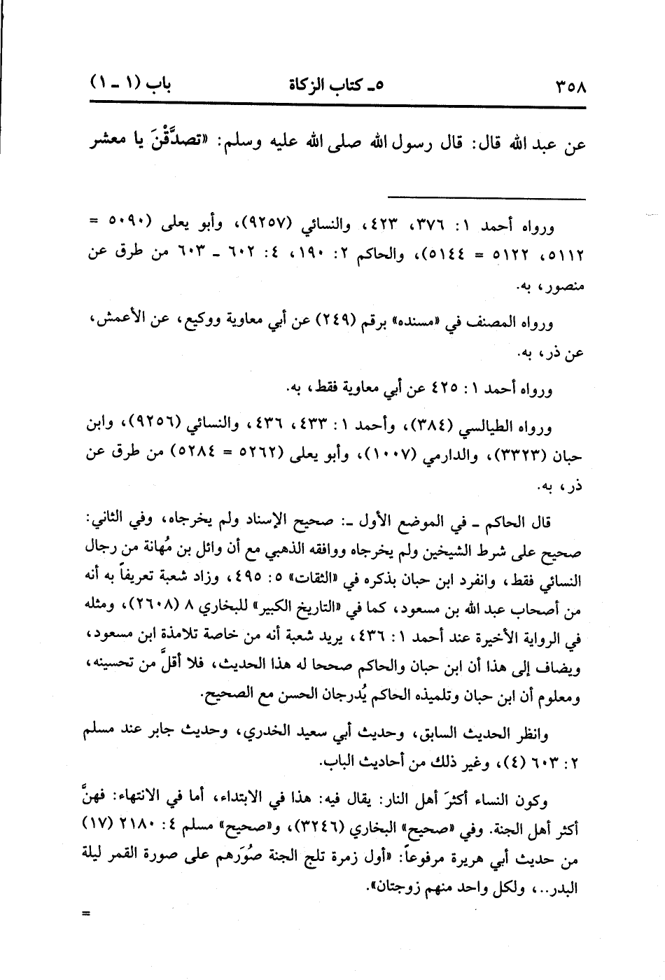 9898- حَدَّثَنَا أَبُو الأَحْوَصِِ ، عَنْ مَنْصُورٍ ، عَنْ ذَرٍّ ، عَنْ وَائِلِ بْنِ مُهَانَةَ ، عَنْ عَبْدِ اللهِ ، قَالَ : قَالَ رَسُولُ اللهِ صَلَّى الله عَلَيْهِ وَسَلَّمَ : تَصَدَّقْنَ يَا مَعْشَرَ النِّسَاءِ ، فَإِنَّكُنَّ أَكْثَرُ أَهْلِ جَهَنَّمَ ، فَقَالَتِ امْرَأَةٌ لَيْسَتْ مِنْ عِلْيَةِ النِّسَاءِ : مِمَّ ذَلِكَ يَا رَسُولَ اللهِ ؟ قَالَ : لأَنَّكُنَّ تُكْثِرْنَ اللَعَنَ وَتَكْفُرْنَ الْعَشِيرَ. (3/110).