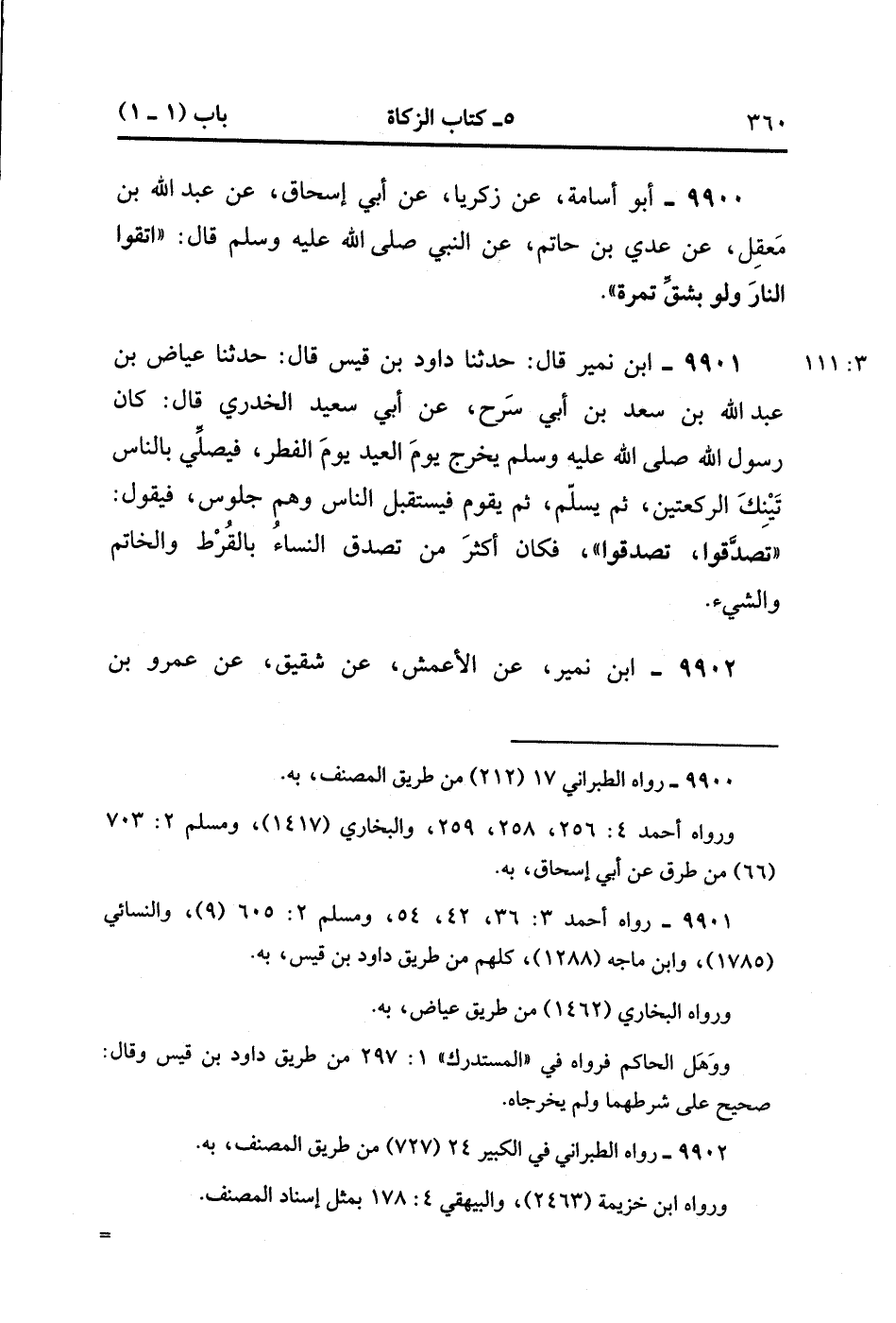 9900- حَدَّثَنَا أَبُو أُسَامَةَ ، عَنْ زَكَرِيَّا ، عَنْ أَبِي إِسْحَاقَ ، عَنْ عَبْدِ اللهِ بْنِ مُعْقَلٍ ، عَنْ عَدِيِّ بْنِ حَاتِمٍ ، عَنِ النَّبِيِّ صَلَّى الله عَلَيْهِ وَسَلَّمَ ، قَالَ : اتَّقُوا النَّارَ وَلَوْ بِشِقِّ تَمْرَةٍ.