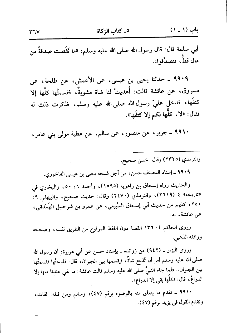 9909- حَدَّثَنَا يَحْيَى بْنُ عِيسَى ، عَنِ الأَعْمَشِ ، عَنْ طَلْحَةَ ، عَنْ مَسْرُوقٍ ، عَنْ عَائِشَةَ ، قَالَتْ : أُهْدِيَتْ لَنَا شَاةٌ مَشْوِيَّةٌ ، فَقَسَّمْتُهَا كُلَّهَا إِلاَّ كَتِفَهَا ، فَدَخَلَ عَلَيَّ رَسُولُ اللهِ صَلَّى الله عَلَيْهِ وَسَلَّمَ فَذَكَرْتُ ذَلِكَ لَهُ ، فَقَالَ : لاَ ، كُلُّهَا لَكُمْ إِلاَّ كَتِفَهَا. (3/112).