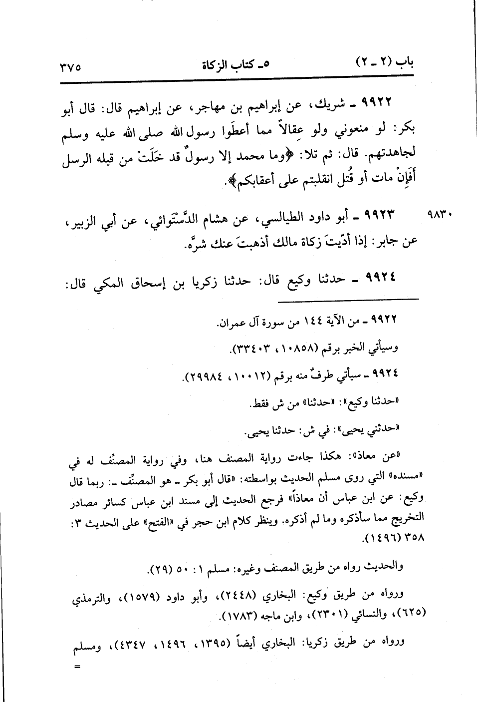 9923- حَدَّثَنَا أَبُو دَاوُدَ الطَّيَالِسِيُّ ، عَنْ هِشَامٍ الدَّسْتُوَائِيِّ ، عَنْ أَبِي الزُّبَيْرِ ، عَنْ جَابِرٍ ؛ إذَا أَدَّيْتَ زَكَاةَ مَالِكَ ، أَذْهَبْتَ عَنْك شَرَّهُ. (3/114).