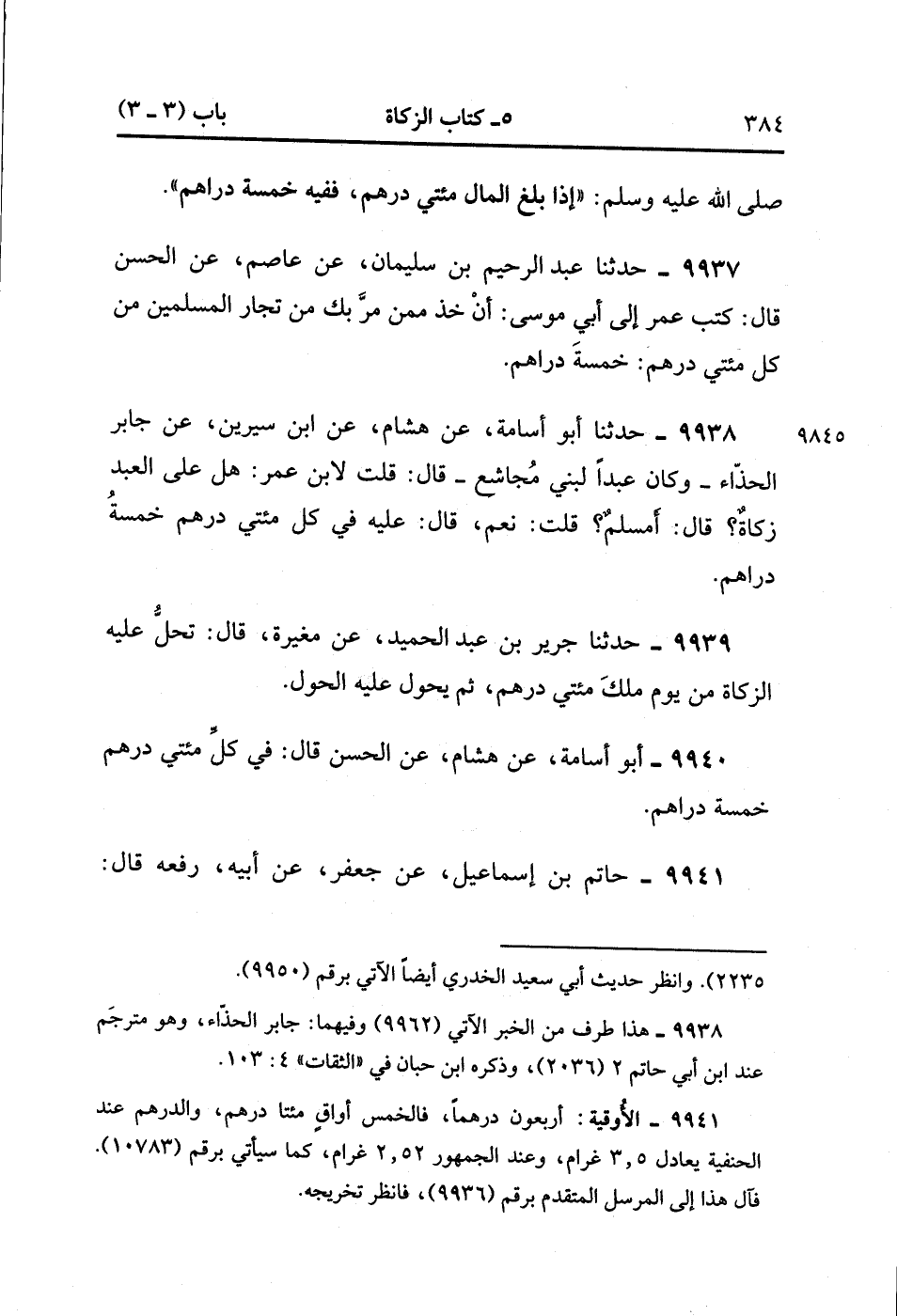9941- حَدَّثَنَا حَاتِمُ بْنُ إسْمَاعِيلَ ، عَنْ جَعْفَرٍ ، عَنْ أَبِيهِ ، رَفَعَهُ ، قَالَ : إذَا بَلَغَتْ خَمْسَ أَوَاقٍ فَفِيهَا خَمْسَةُ دَرَاهِمَ ، وَفِي كُلِّ أَرْبَعِينَ دِرْهَمًا دِرْهَمٌ. (3/116).