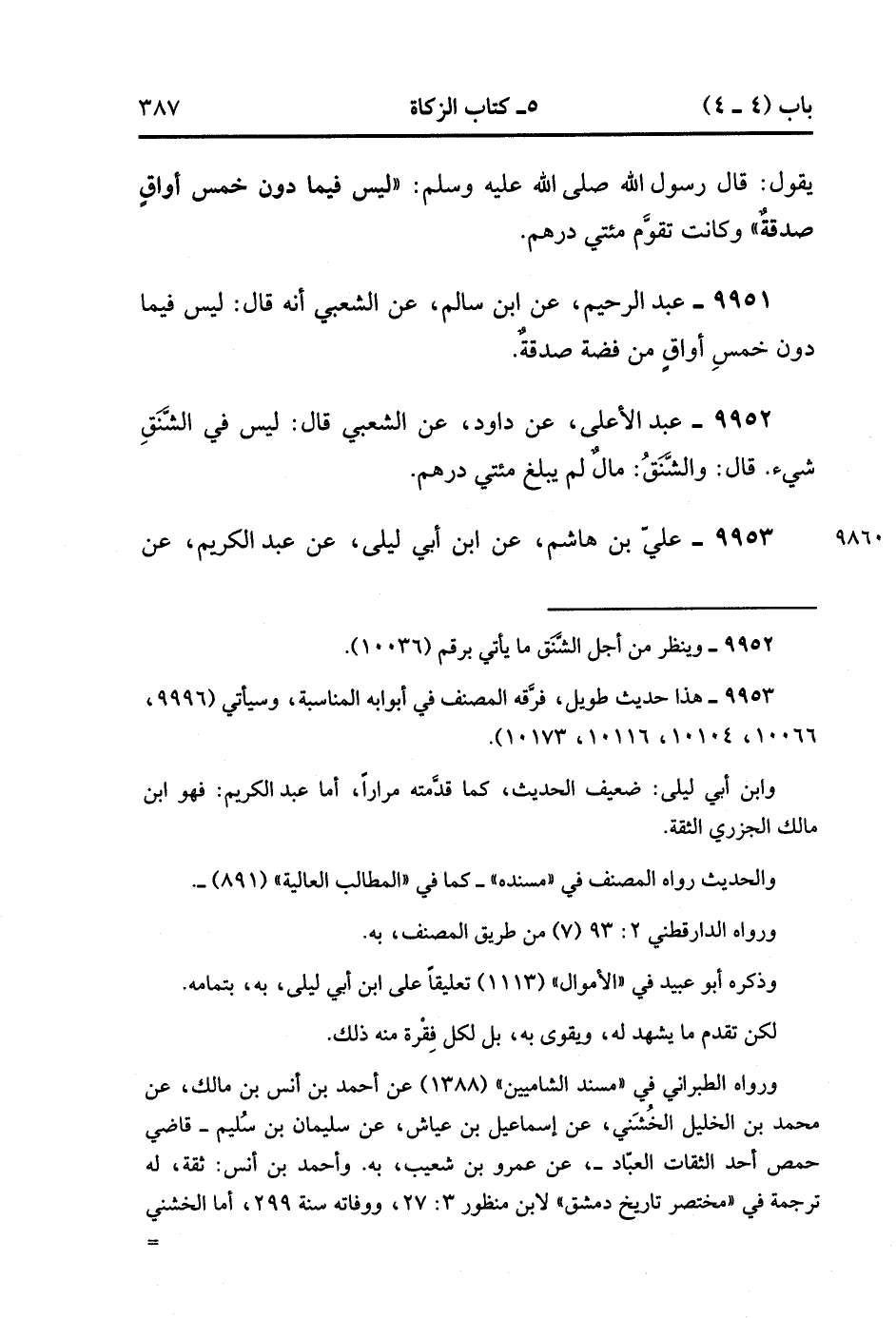 9952- حَدَّثَنَا عَبْدُ الأَعْلَى ، عَنْ دَاوُدَ ، عَنِ الشَّعْبِيِّ ؛ قَالَ : لَيْسَ فِي الشَّنْقِ شَيْءٌ ، قَالَ : الشَّنْقُ : مَالٌ لَمْ يَبْلُغْ مِئَتَيْ دِرْهَمٍ. (3/117).