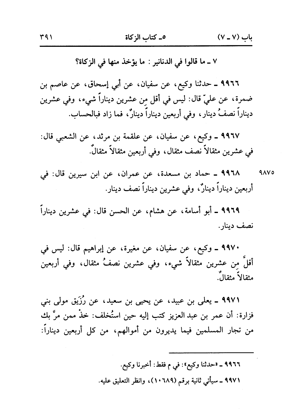 9971- حَدَّثَنَا يَعْلَى بْنُ عُبَيْدٍ ، عَنْ يَحْيَى بْنِ سَعِيدٍ ، عَنْ رُزَيْقٍ مَوْلَى بَنِي فَزَارَةَ ؛ أَنَّ عُمَرَ بْنَ عَبْدِ الْعَزِيزِ كَتَبَ إلَيْهِ حِينَ اسْتُخْلِفَ : خُذْ مِمَّنْ مَرَّ بِكَ مِنْ تُجَّارِ الْمُسْلِمِينَ فِيمَا يُدِيرُونَ مِنْ أَمْوَالِهِمْ ، مِنْ كُلِّ أَرْبَعِينَ دِينَارًا دِينَارًا ، فَمَا نَقَصَ فَبِحِسَابِ مَا نَقَصَ حَتَّى يَبْلُغَ عشرين ، فَإِذَا نَقَصَتْ ثُلُثَ دِينَارٍ فَدَعْهَا ، لاَ تَأْخُذْ مِنْهَا شَيْئًا ، وَاكْتُبْ لَهُمْ بَرَاءَةً بِمَا تَأْخُذُ مِنْهُمْ إلَى مِثْلِهَا مِنَ الْحَوْلِ ، وَخُذْ مِمَّنْ مَرَّ بِكَ مِنْ تُجَّارِ أَهْلِ الذِّمَّةِ ، فِيمَا يُظْهِرُونَ مِنْ أَمْوَالِهِمْ وَيُدِيرُونَ مِنَ التِّجَارَاتِ ، مِنْ كُلِّ عِشْرِينَ دِينَارًا دِينَارًا ، فَمَا نَقَصَ فَبِحِسَابِ مَا نَقَصَ حَتَّى يَبْلُغَ عَشَرَةَ دَنَانِيرَ ، فَإِذَا نَقَصَتْ ثُلُثَ دِينَارٍ فَدَعْهَا ، لاَ تَأْخُذْ مِنْهَا شَيْئًا ، وَاكْتُبْ لَهُمْ بَرَاءَةً إلَى مِثْلِهَا مِنَ الْحَوْلِ بِمَا تَأْخُذُ مِنْهُمْ. (3/119).