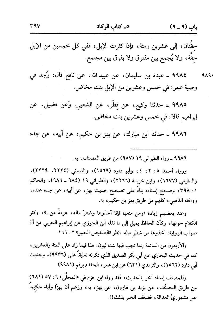 9986- حَدَّثَنَا ابْنُ مُبَارَكٍ ، عَنْ بَهزِ بْنِ حَكِيمٍ ، عَنْ أَبِيهِ ، عَنْ جَدِّهِ ، قَالَ : سَمِعْتُ رَسُولَ اللهِ صَلَّى الله عَلَيْهِ وَسَلَّمَ يَقُولُ : فِي كُلِّ إبِلٍ سَائِمَةٍ أَرْبَعِينَ بِنْتُ لَبُونٍ ، لاَ يُفَرَّقُ إبِلٌ عَنْ حِسَابِهَا ، مَنْ أَعْطَاهَا مُؤْتَجِرًا فَلَهُ أَجْرُهُ ، عَزْمَةٌ مِنْ عَزَمَاتِ رَبِّنَا ، لاَ يَحِلُّ لآلِ مُحَمَّدٍ مِنْهَا شَيْءٌ. (3/122).