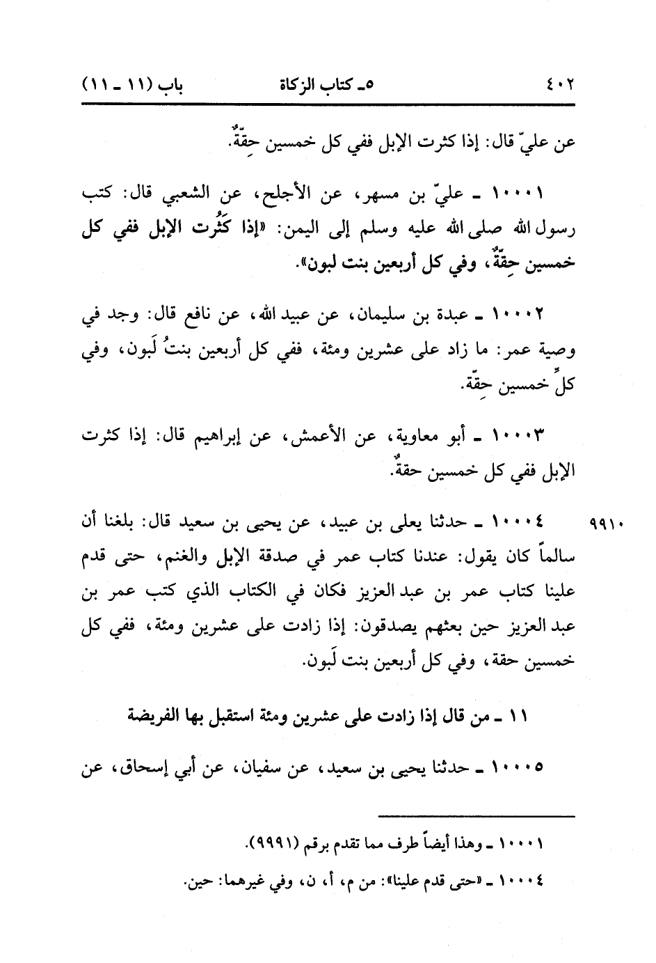 10002- حَدَّثَنَا عَبْدُ بْنُ سُلَيْمَانَ ، عَنْ عُبَيْدِ اللهِ ، عَنْ نَافِعٍ ، قَالَ : وُجِدَ فِي وَصِيَّةِ عُمَرَ : مَا زَادَ عَلَى عِشْرِينَ وَمِئَةٍ ، فَفِي كُلِّ أَرْبَعِينَ بِنْتُ لَبُونٍ ، وَفِي كُلِّ خَمْسِينَ حِقَّةٌ.