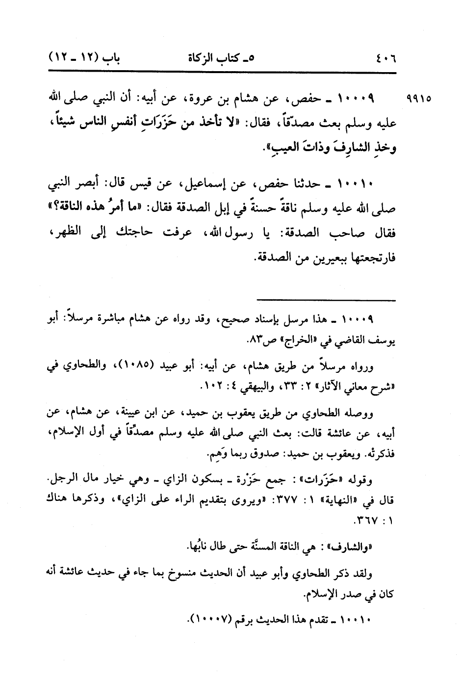 10009- حَدَّثَنَا حَفْصٌ ، عَنْ هِشَامِ بْنِ عُرْوَةَ ، عَنْ أَبِيهِ ؛ أَنَّ النَّبِيَّ صَلَّى الله عَلَيْهِ وَسَلَّمَ بَعَثَ مُصَدِّقًا ، فَقَالَ : لاَ تَأْخُذْ مِنْ حَزَرَاتِ أَنْفُسِ النَّاسِ شَيْئًا ، وَخُذِ الشَّارِفَ ، وَذَاتَ الْعَيْبِ.