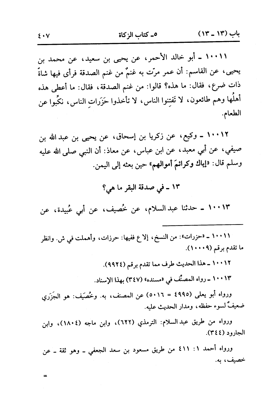 10012- حَدَّثَنَا وَكِيعٌ ، عَنْ زَكَرِيَّا بْنِ إِسْحَاقَ ، عَنْ يَحْيَى بْنِ عَبْدِ اللهِ بْنِ صَيْفِيٍّ ، عَنْ أَبِي مَعْبَدٍ ، عَنِ ابْنِ عَبَّاسٍ ، عَنْ مُعَاذٍ ، أَنَّ النَّبِيَّ صَلَّى الله عَلَيْهِ وَسَلَّمَ ، قَالَ : إيَّاكَ وَكَرَائِمَ أَمْوَالِهِمْ ، حِينَ بَعَثَهُ إلَى الْيَمَنِ. (3/126).
