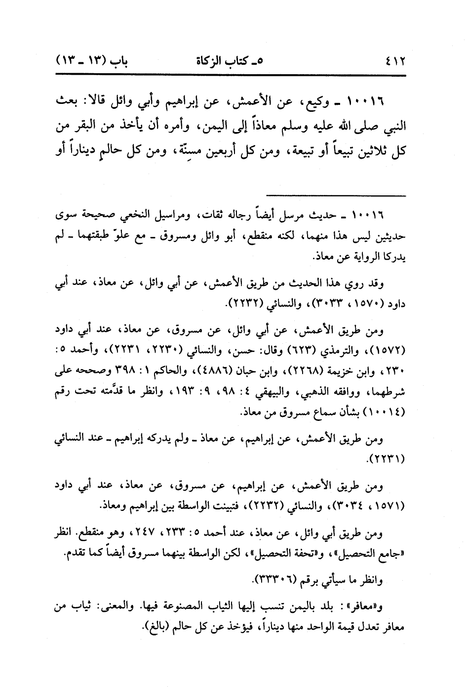 10016- حَدَّثَنَا وَكِيعٌ ، عَنِ الأَعْمَشِ ، عَنْ إبْرَاهِيمَ ، وَأَبِي وَائِلٍ ، قَالاَ : بَعَثَ النَّبِيُّ صَلَّى الله عَلَيْهِ وَسَلَّمَ مُعَاذًا إلَى الْيَمَنِ ، وَأَمَرَهُ أَنْ يَأْخُذَ مِنَ الْبَقَرِ مِنْ كُلِّ ثَلاَثِينَ تَبِيعًا ، أَوْ تَبِيعَةً ، وَمِنْ أَرْبَعِينَ مُسِنَّةً ، وَمِنْ كُلِّ حَالِمٍ دِينَارًا ، أَوْ عَدْلَهُ مِنَ الْمَعَافِرِ. (3/127).