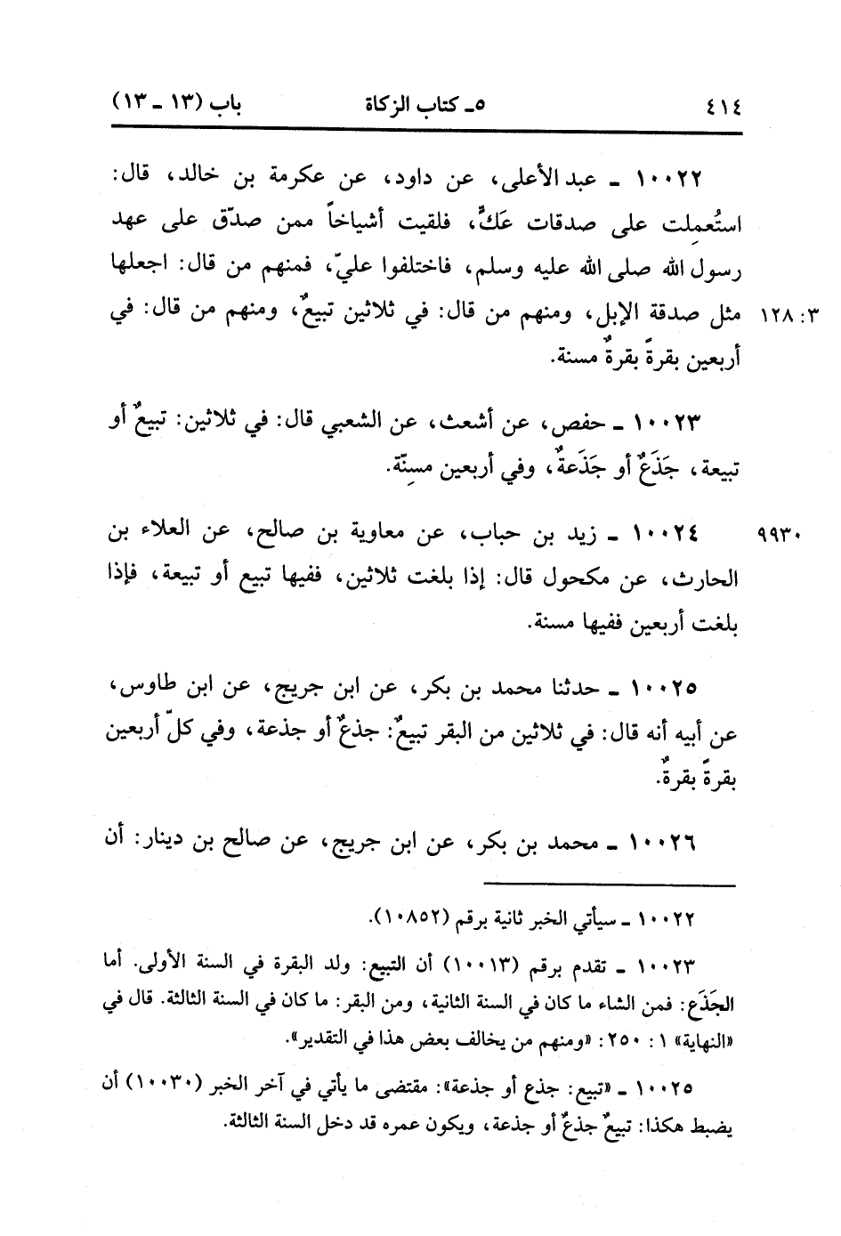 10026- حَدَّثَنَا مُحَمَّدُ بْنُ بَكْرٍ ، عَنِ ابْنِ جُرَيْجٍ ، عَنْ صَالِحِ بْنِ دِينَارٍ ؛ أَنَّ عُمَرَ بْنَ عَبْدِ الْعَزِيزِ كَتَبَ إلَى عُثْمَانَ بْنِ مُحَمَّدِ بْنِ أَبِي سُوَيْد : أَنْ يَأْخُذَ مِنْ كُلِّ ثَلاَثِينَ بَقَرَةً تَبِيعًا ، وَمِنْ كُلِّ أَرْبَعِينَ بَقَرَةً بَقَرَةً ، وَلَمْ يَزِدْ عَلَى ذَلِكَ. (3/128).