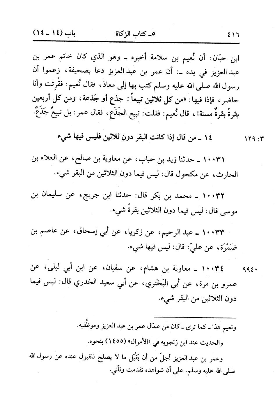 10031- حَدَّثَنَا زَيْدُ بْنُ حَبَّابٍ ، عَنْ مُعَاوِيَةَ بْنِ صَالِحٍ ، عَنِ الْعَلاَءِ بْنِ الْحَارِثِ ، عَنْ مَكْحُولٍ ، قَالَ : لَيْسَ فِيمَا دُونَ الثَّلاَثِينَ مِنَ الْبَقَرِ شَيْءٌ.
